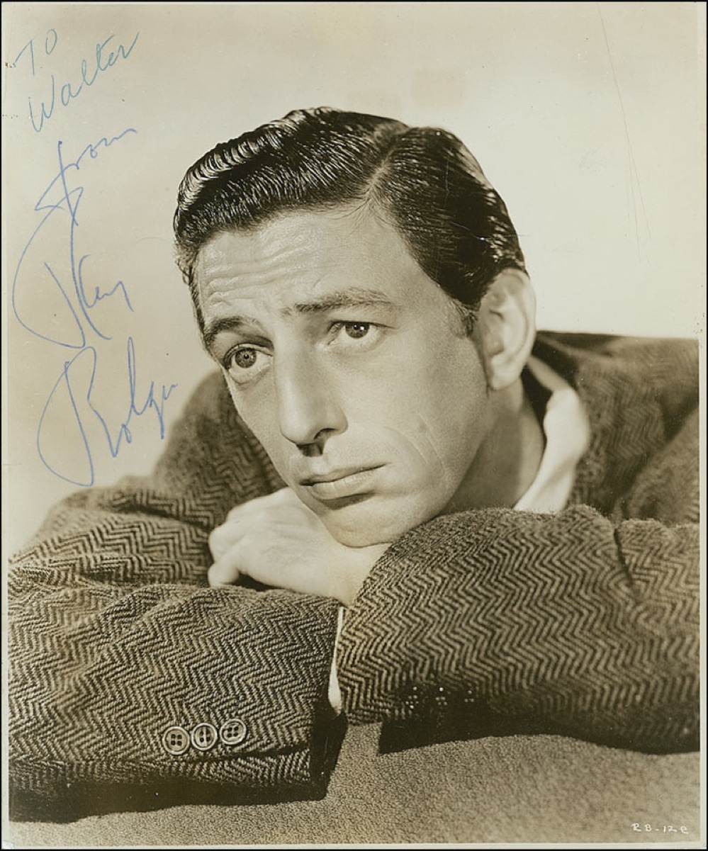 Vintage glossy photo trimmed in size to 7.5 x 9, signed and inscribed in ballpoint “To Walter from Ray Bolger.” In very good condition, with trimming as noted, and scattered impressions, surface marks, and creases (lightly touching last name and face). Pre-certified PSA/DNA and RRAuction COA.