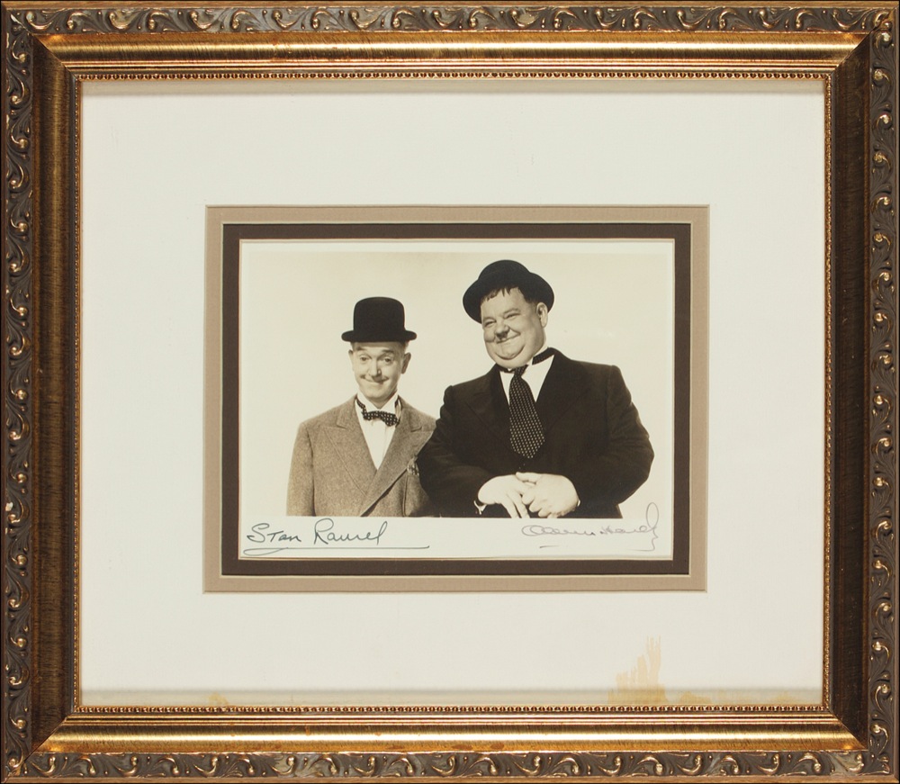 Vintage matte-finish 6.75 x 5.25 photo of the comedy team smiling pleasantly, signed in the lower border in fountain pen, “Stan Laurel,” and “Oliver Hardy.” Triple matted and framed to an overall size of 14 x 12. In fine condition, with a bit of light silvering to a few dark areas of image, and light staining to mat. RRAuction COA.
