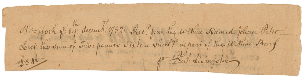 Signer of the Declaration of Independence from New York (1716–1778). ADS, signed “Phil: Livingston,” one page, 8 x 1.75, December 19, 1752. In full: “Recd from the within Named John Peter Obert the Sum of Five pounds Sixteen shillgs in part of the Within Bond.” Signed at the bottom by Livingston. Show-through from text on reverse, light vertical wrinkling, and mild toning, otherwise fine condition. RRAuction COA.