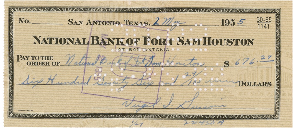 Personal check, 6.25 x 2.75, filled out and signed by Grissom, payable to National Bank of Fort Sam Houston for $676.29, May 2, 1955. Punch cancellations and bank stamps (the latter lightly touching first name), otherwise fine, clean condition. JSA/Scott Cornish Auction LOA and RRAuction COA.