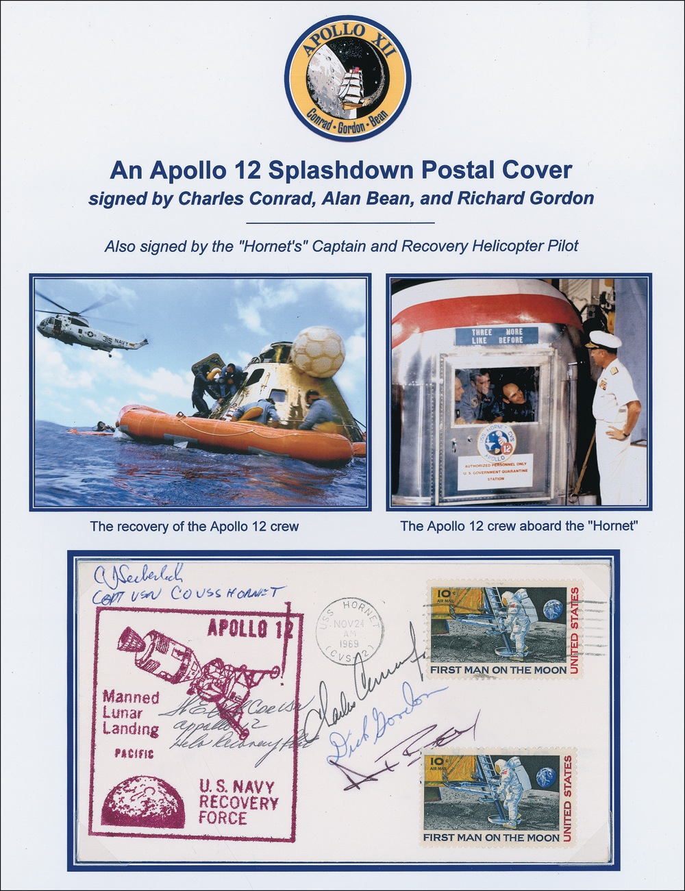 Commemorative postal cover, 6.5 x 3.5, 1956, with a stamped cachet honoring the Apollo 12 Recovery Force, signed in various inks by Charles Conrad, Jr., Dick Gordon, and Alan Bean, and also signed by two recovery personnel. Removably presented on a color 8.5 x 11 informational sheet. Affixed stamp covering a tiny portion of Bean’s “B,” and the first letter of Conrad’s signature just touching another signature, otherwise fine condition. JSA/Scott Cornish Auction LOA and RRAuction COA.