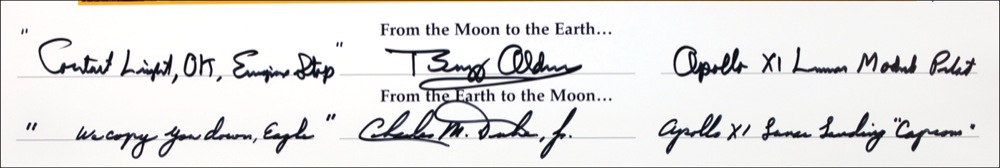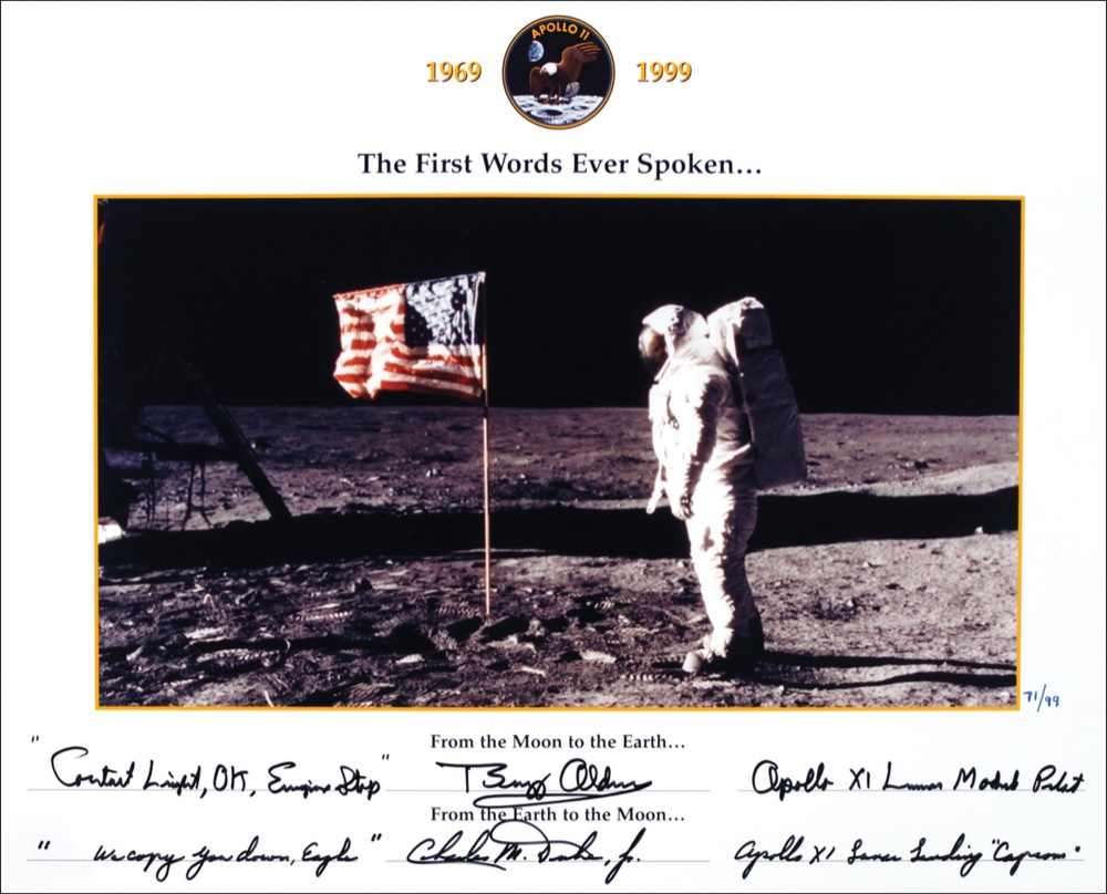 Limited edition color satin-finish 20 x 16 photo of Aldrin on the lunar surface, numbered 71/99, commemorating the first words spoken from the moon, signed in black felt tip by the two astronauts who made the exchange between the moon and mission control: “‘Contact light, OK, Engine stop,’ Buzz Aldrin, Apollo XI Lunar Module Pilot” and “‘We copy you down Eagle,’ Charles M. Duke, Jr., Apollo XI Lunar Landing ‘CAPCOM.’” In very fine condition. JSA/Scott Cornish Auction LOA and RRAuction COA.