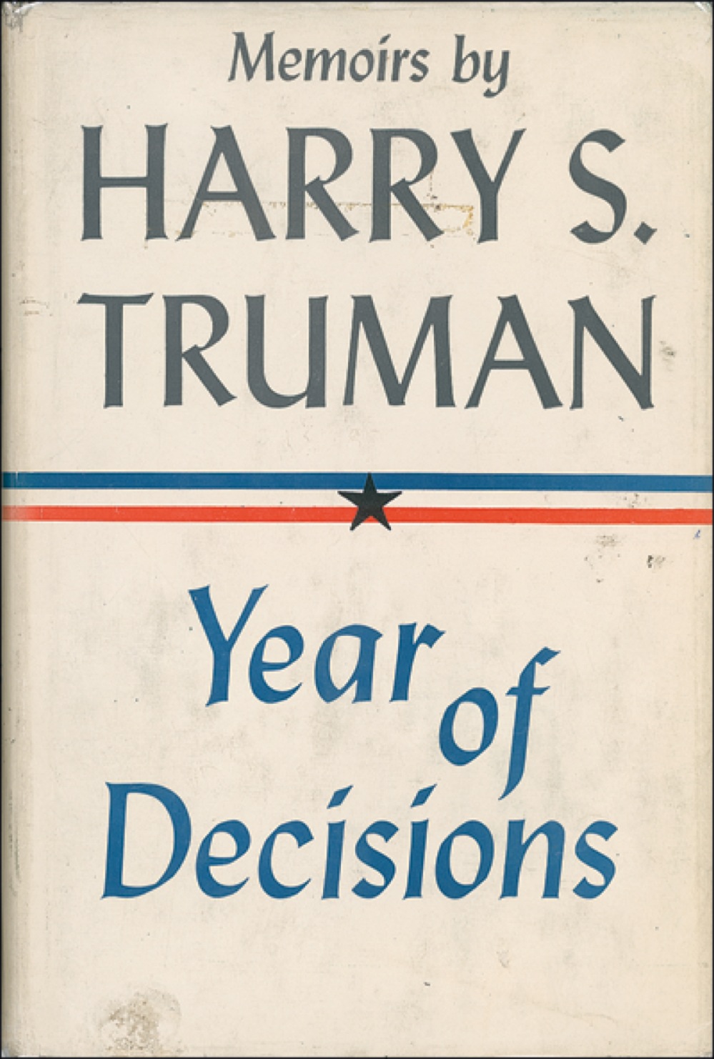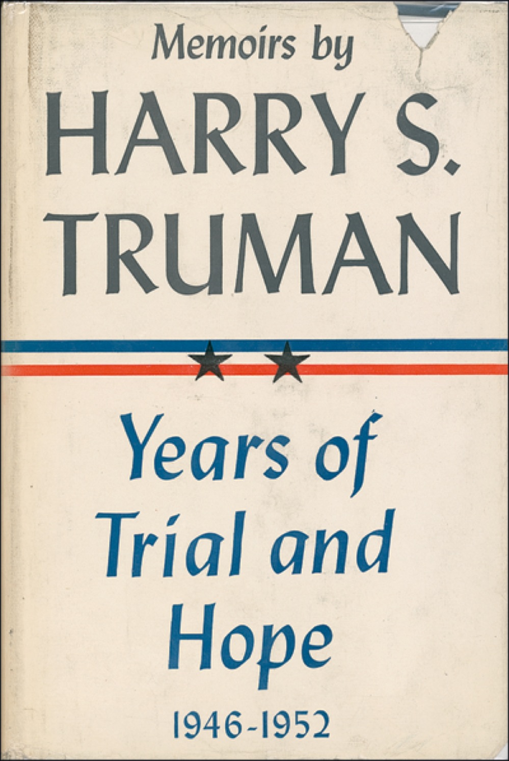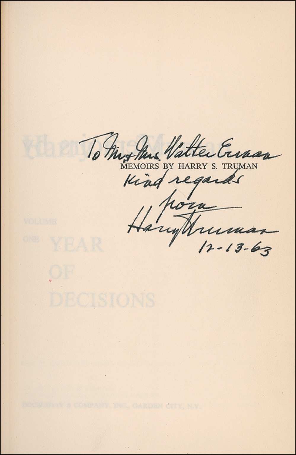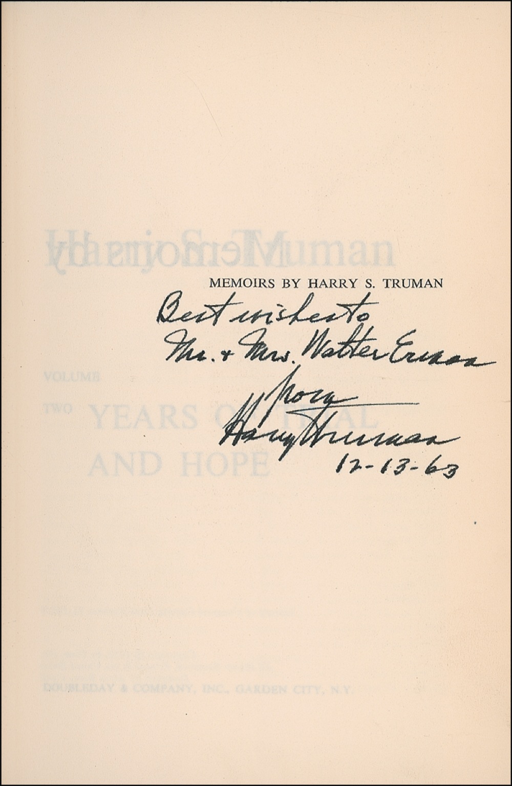Signed book: Memoirs (Year of Decisions and Years of Trial and Hope) in two volumes. First edition. Garden City: Doubleday & Company, 1956. Hardcover with dustjacket, 6 x 8.5, 594 plus 596 pages. Each volume is signed and inscribed in ink on the half-title page, “To Mr. and Mrs. Walter E—, Kind regards from Harry S. Truman, 12-13-63.” In very good condition, with soiling, tears, and wear to jackets, and ink stamps and skinning to front pastedowns (slightly offsetting to opposite pages). JSA/John Reznikoff Auction LOA and RRAuction COA.