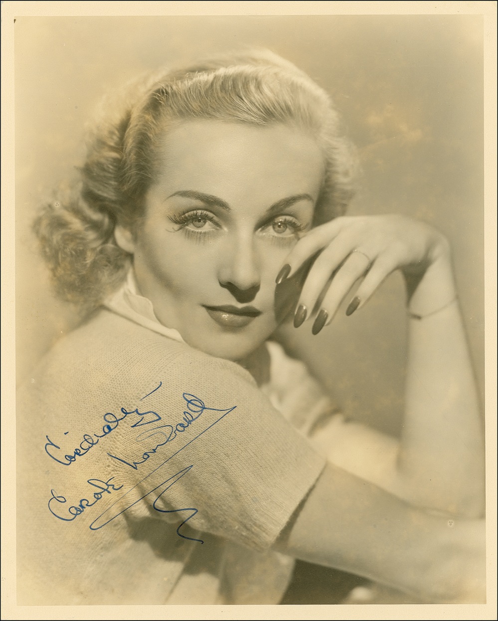 American actress (1908–1942) who enjoyed great success as a popular screen comedienne in the 1930s and who became Mrs. Clark Gable in 1939. On January 16, 1942, the plane in which Lombard was traveling en route to a war bond rally crashed into Mount Potosi near Las Vegas, killing all 22 aboard. Splendid vintage sepia matte-finish 8 x 10 photo, signed in ink “Cordially, Carole Lombard.” A few tiny, trivial surface marks, otherwise very fine, clean condition. Quite exceptional! RRAuction COA.