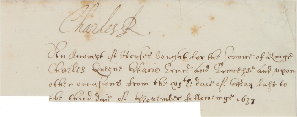 King of England, Scotland, and Ireland (born 1600) from 1625 until his execution in the wake of the English Civil War in 1649. Following the Protectorate rule of Oliver Cromwell and his son, Richard, Charles’s line was restored to the throne with the succession of his son, Charles II, in 1660, whose reign was retroactively dated to 1649. Scarce manuscript DS, signed “Charles R.,” one page, 6 x 2.5 (irregular), November 3, 1637. A document relating to the purchase of horses purchased for Queen Marie. Matted and framed with an antique portrait engraving to an overall size of 10 x 16. In very good condition, with irregular trimming to bottom edge as noted, light soiling and wrinkling, and scattered spotting (a few spots touching signature). JSA/John Reznikoff Auction LOA and RRAuction COA.