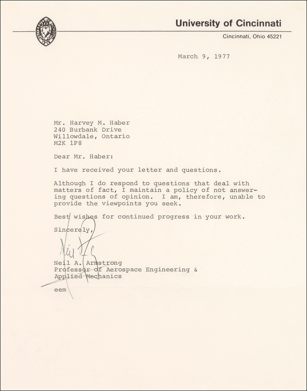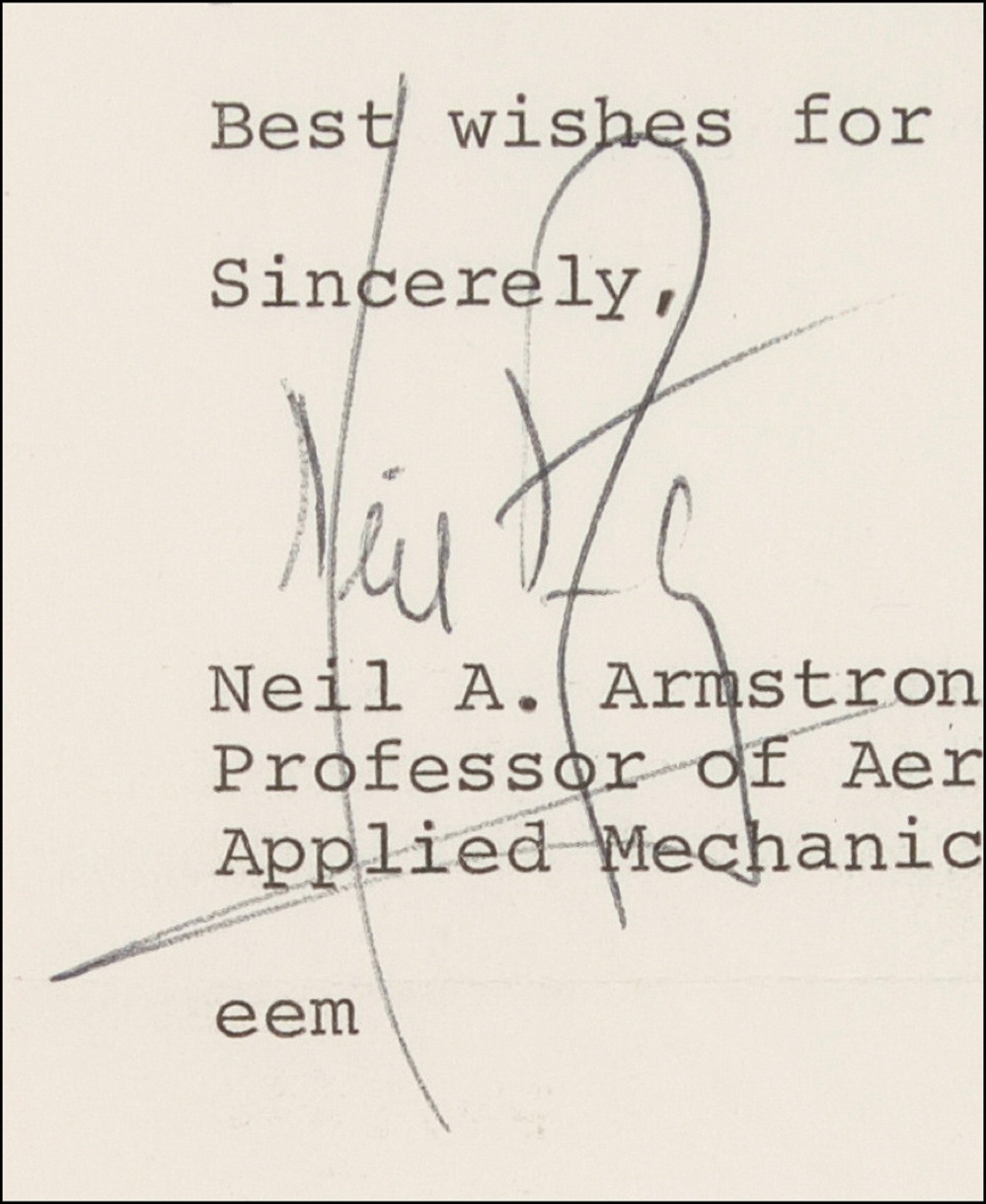 TLS, one page, 7.75 x 9.75, University of Cincinnati letterhead, March 9, 1977. Armstrong writes to Harvey M. Haber in Willowdale, Ontario. In part: “Although I do respond to questions that deal with matter of fact, I maintain a policy of not answering questions of opinion. I am, therefore, unable to provide the viewpoints you seek….” Accompanied by a letter from Armstrong’s secretary to Haber, dated March 30, 1977. In part: “Professor Armstrong has asked me to respond to your letter. As he has described in many past flight press conferences, the phrases in question emerged from Professor Armstrong’s thoughts after the successful landing. They are, of course, a natural consequence of the ‘step’ from the lunar module to the lunar surface….” Matted and framed together with a photo to an overall size of 32 x 19. In fine condition. JSA/Scott Cornish Auction LOA and RRAuction COA. Oversized.