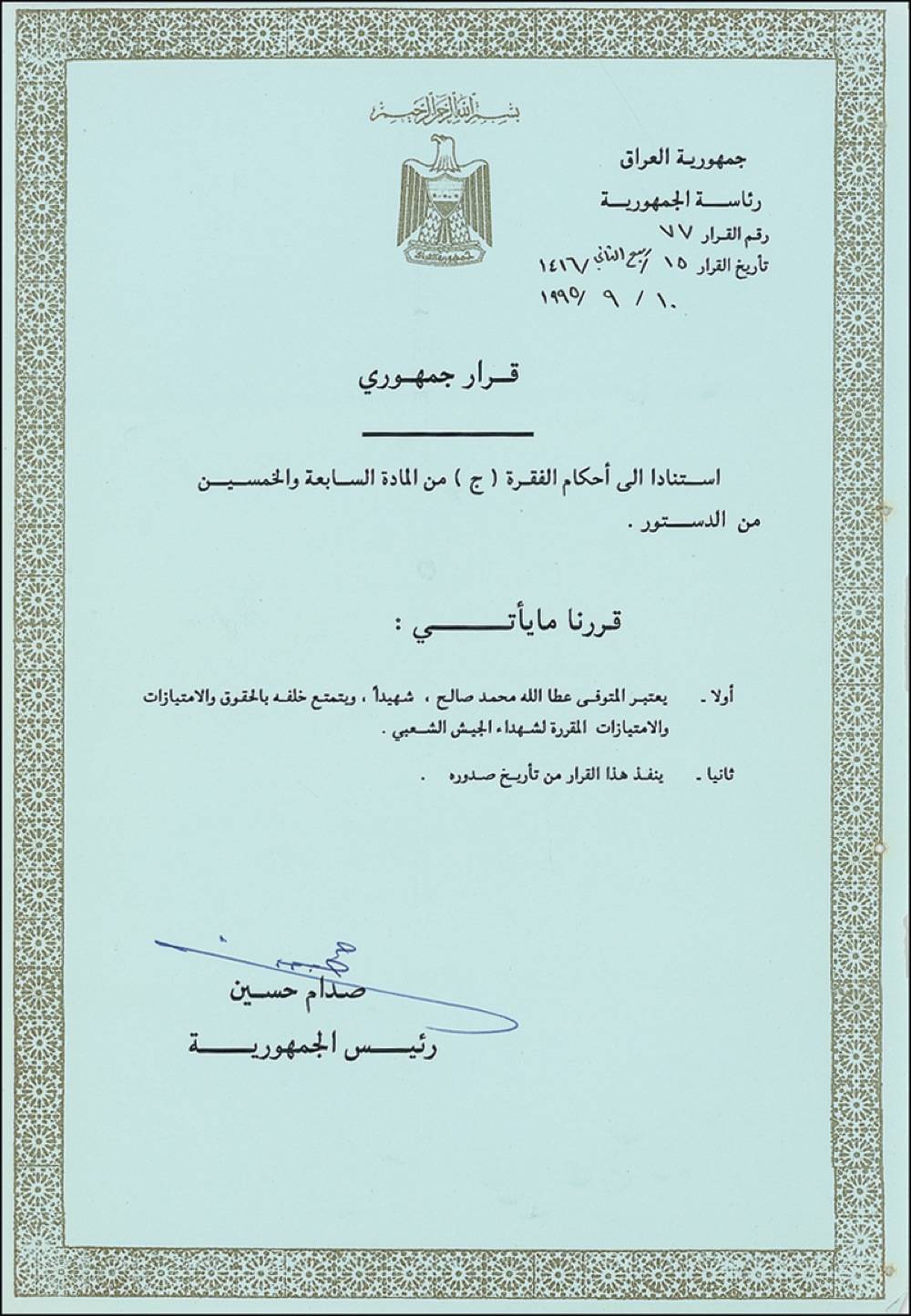 DS, in Arabic, one page, 8.25 x 12, circa 1990s. An untranslated typed document bearing a printed eagle with shield device at the top of the page, signed in blue ink at lower left. Small file holes to right margin, otherwise fine, clean condition. RRAuction COA.