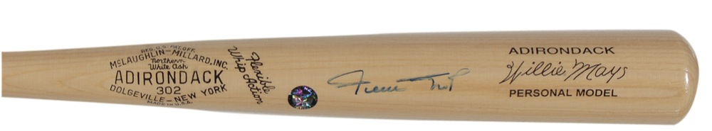 Official Adirondack Willie Mays model baseball bat, signed in blue felt tip on the barrel. In fine condition, with a PSA/DNA authentication label affixed to knob. JSA/Mike Gutierrez Auction LOA and RRAuction COA.