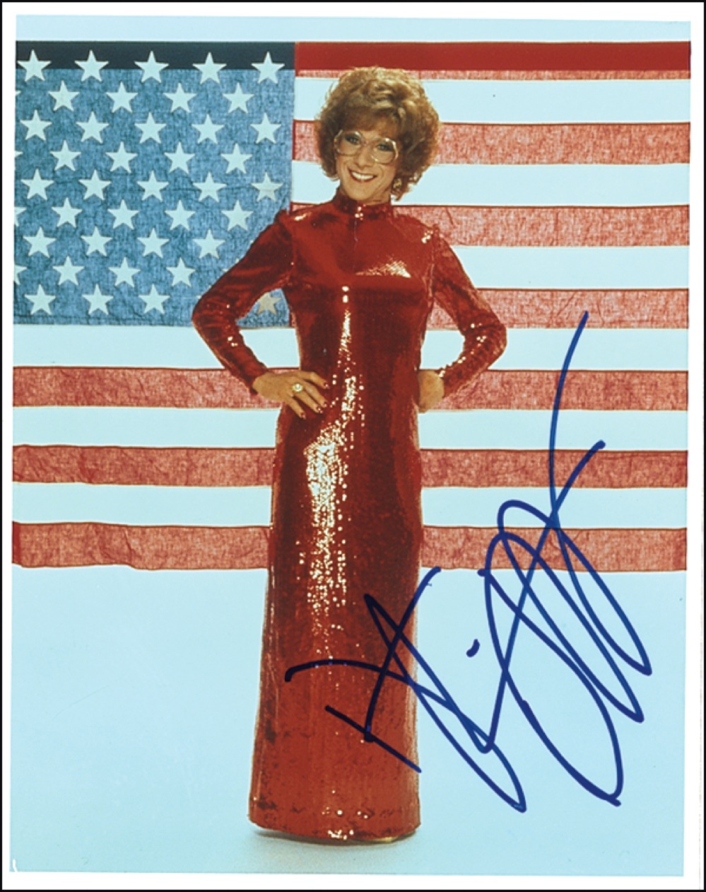 Two different color glossy 8 x 10 photos of Hoffman, including one as Tootsie, each signed in blue felt tip. In very fine condition. RRAuction COA.