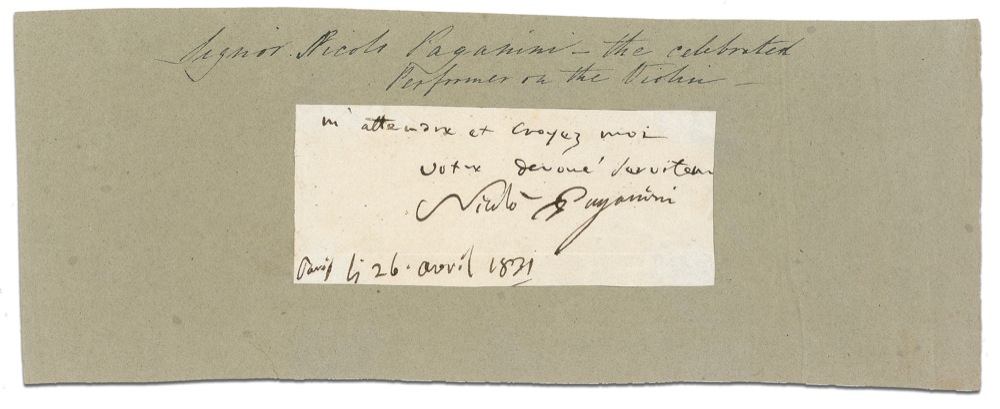 Remarkable Italian violinist and composer (1782–1840) generally regarded as the greatest virtuoso in the history of the instrument. Paganini’s striking appearance and seemingly superhuman skill on the instrument led many to believe that he was in league with the devil, an image he did nothing to dispel. His fiendishly demanding (and sometimes beautiful) works for the violin, particularly the Caprices, remain a cornerstone of the repertoire. Scarce ink signature, “Nicolo Paganini, Paris, le 26 Avril 1831,” adding a sentiment in French, on an off-white 4 x 1.75 slip affixed to an early gray-green 9 x 3.5 sheet with collector’s descriptive caption. After enjoying tremendous success in Italy, Austria, and Germany, Paganini made his Paris debut on March 9, 1831, followed by his London debut on June 3. Tiny edge tear and faint horizontal fold to slip, otherwise fine condition. A bold and handsome example! RRAuction COA.