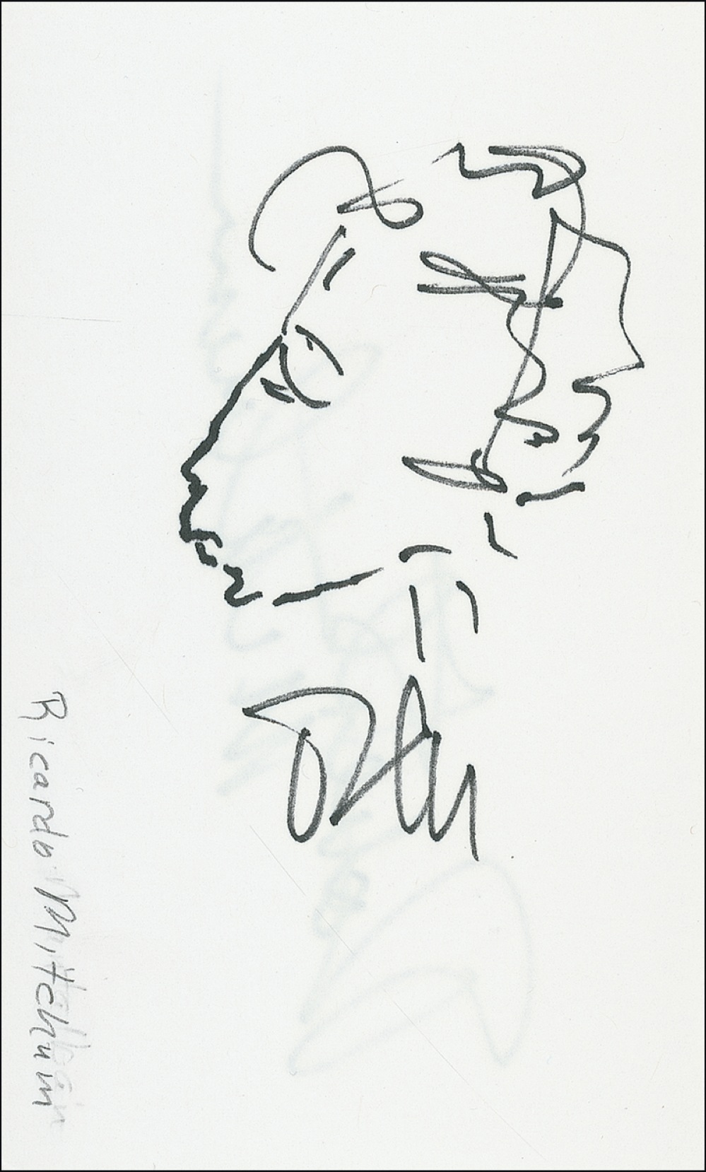 Original felt tip self-portrait on an off-white 3 x 5 card, initialed under the sketch and signed in full on the reverse. In fine condition, with pencil notation to sketch side. RRAuction COA.