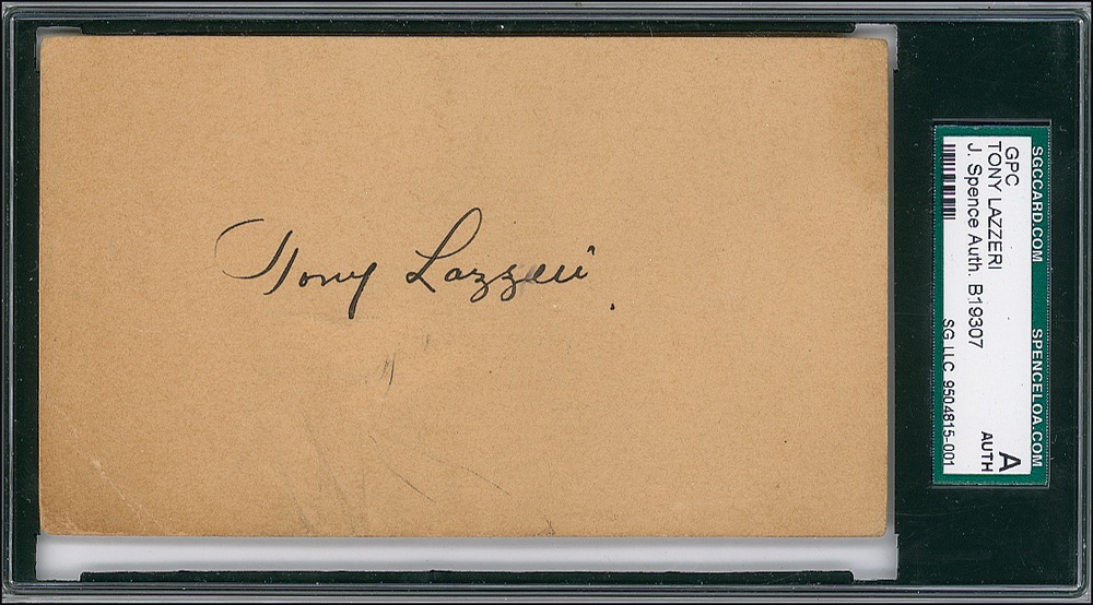 Vintage fountain pen signature, “Tony Lazzeri,” on an off-white 5.5 x 3.25 government postcard. Encapsulated in a plastic James Spence authentication holder. In fine condition, with uniform toning,and a few light creases and ink marks, none affecting signature. JSA/Mike Gutierrez Auction LOA and RRAuction COA.