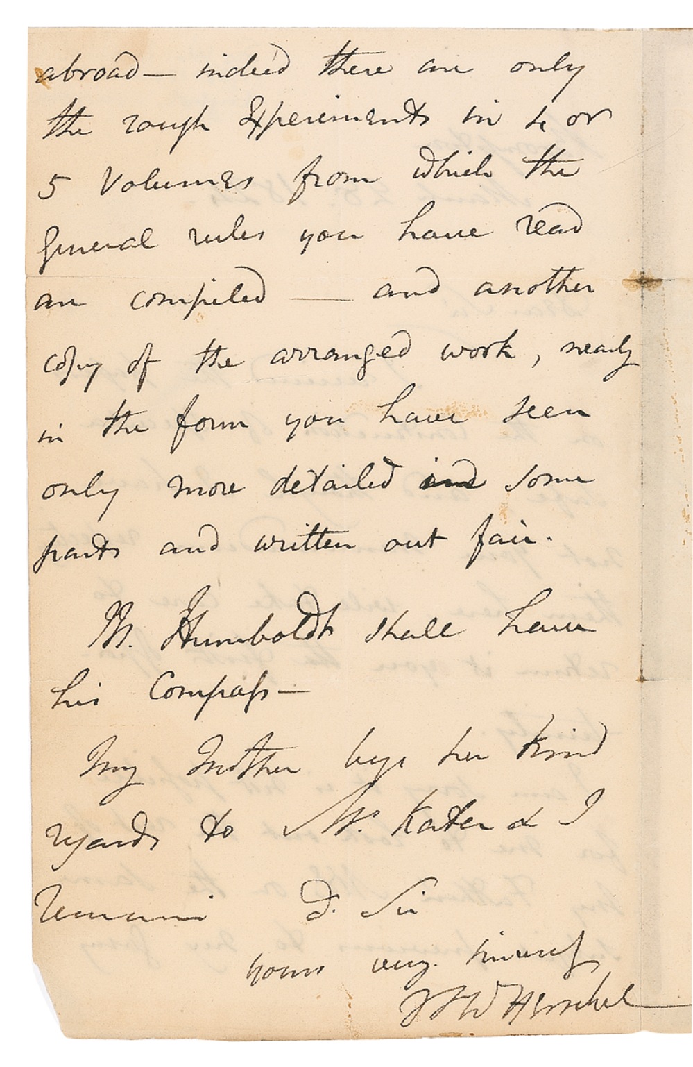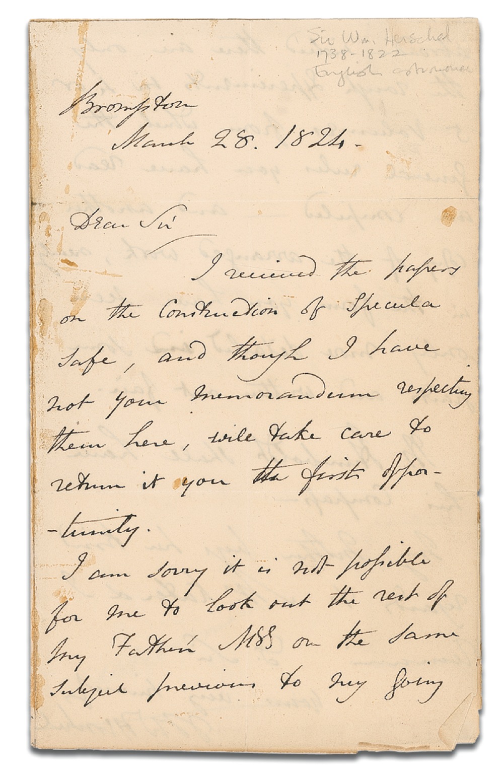 British mathematician, astronomer, and inventor (1792–1871) known for his discoveries related to the moons of Saturn and Uranus and for his pioneering work in early photographic processes, including coining the word “photography” itself and explaining the concepts of negative and positive in relation to photography. ALS signed “J. F. W. Herschel,” one page both sides, 4.5 x 7.5, March 28, 1824, referring to his father Sir William Herschel, the discoverer of Uranus and to Alexander Humbolt, the famous naturalist and explorer. Herschel writes from Brompton to Major Kater. In part: “I received the papers on the Construction of Specula safe…. I am sorry it is not possible for me to look out the rest of my Father’s MSS on the same subject previous to my going abroad—indeed there are only the rough experiments in 4 or 5 volumes from which the general rules you have read are compiled…. Mr. Humboldt shall have his compass….” The adjacent leaf bears the address panel. In very good condition, with intersecting folds (a few edge separations), light edge wear with a few tiny chips (small tear to last letter of signature), and scattered light soiling and (mostly marginal) glue stains. RRAuction COA.