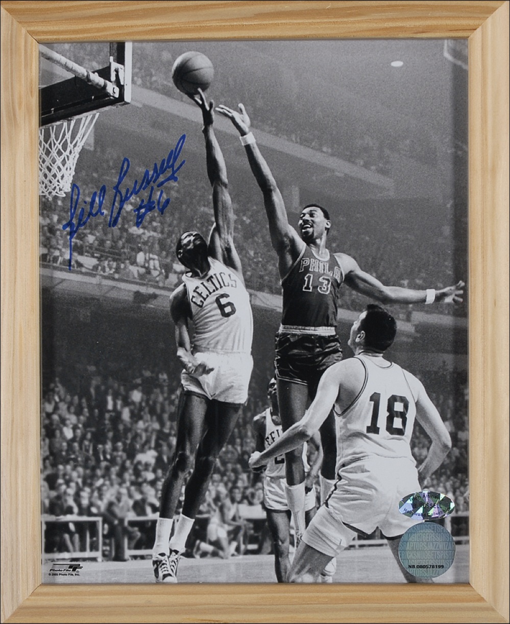Glossy 8 x 10 photo of Russell defending a shot from Wilt Chamberlain, signed in blue felt tip “Bill Russell #6.” Framed to an overall size of 9 x 11.25. In very fine condition. JSA/Mike Gutierrez Auction LOA and RRAuction COA.