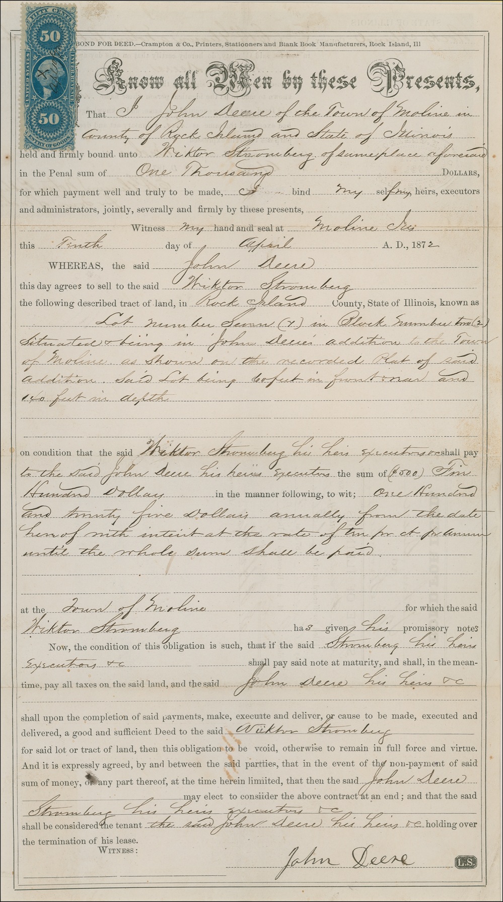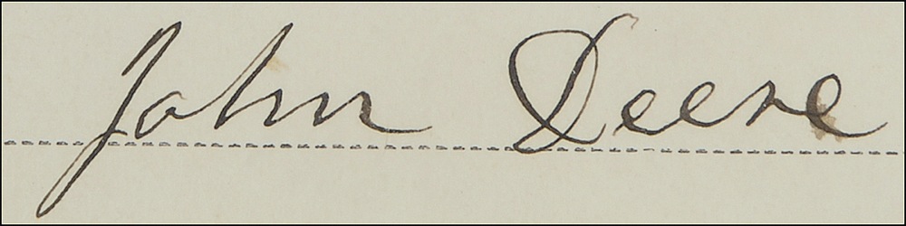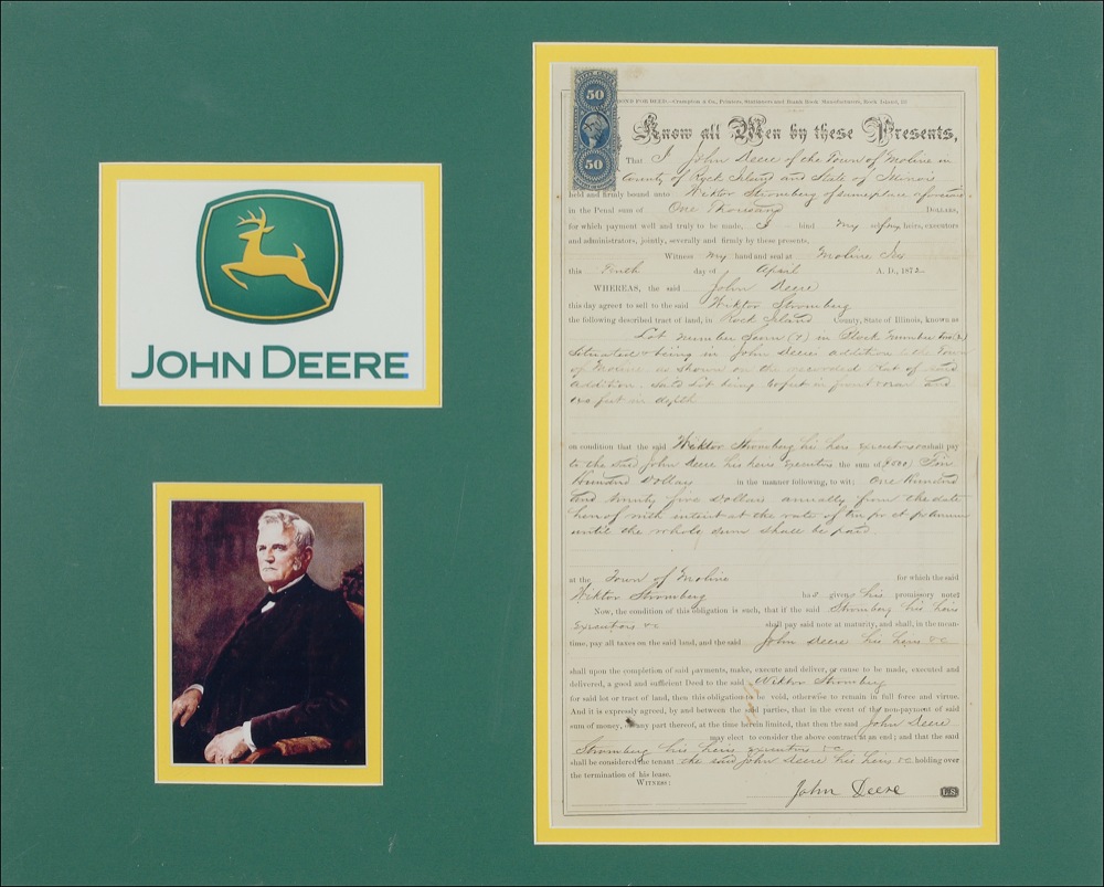 A rare find indeed! This bond for a land deed carries the signature of agricultural and construction equipment mogul John Deere (1804-1886). Issued to secure the sale of land owned by Deere in Moline, Illinois (the town in which he founded Deere & Company), the bond is boldly penned, “John Deere” along the signature line at bottom right. The terms of the agreement are featured on both sides of the partly printed 7.5 x 13.5 legal document, which is dated April 10, 1872. The well-preserved souvenir is entirely intact, and is accompanied by a John Deere logo and photograph. All three pieces are matted and framed to an overall size of 20 x 16. Light soiling and unobtrusive handling wear, otherwise fine condition. RRAuction COA.