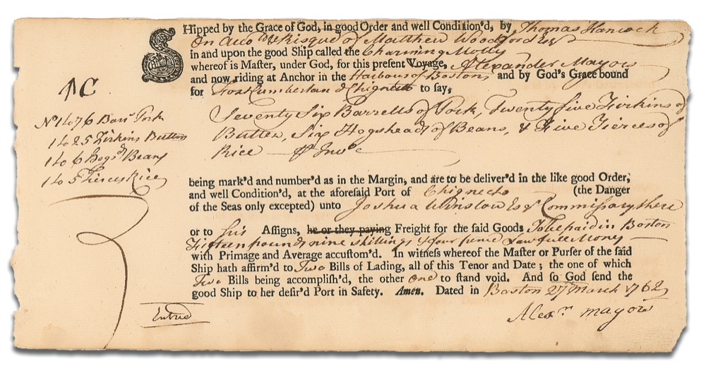 Partly printed unsigned DS filled out in Hancock’s hand (and including his surname “Hancock”), one page, 9 x 4.5, March 27, 1762. A bill of lading. In part: “Shipped by the Grace of God, in good Order and well Condition’d, by Thomas Hancock ... in and upon the good Ship called the Charming Molly whereof is Master, under God, for this present Voyage, Alexander Mayor and now riding at Anchor in the Harbour of Boston and by God’s Grace bound for Chignecto to say, Seventy five barrels of Pork, Twenty Five Firkins of Butter, Six Hogshead of Beans, & Five Tierces of Rice ... being mark’d and number’d as in the Margin, and are to be deliver’d in the like good Order.” In fine condition, with a rough left edge and light toning. More than 50 words in Hancock’s hand. RRAuction COA.
