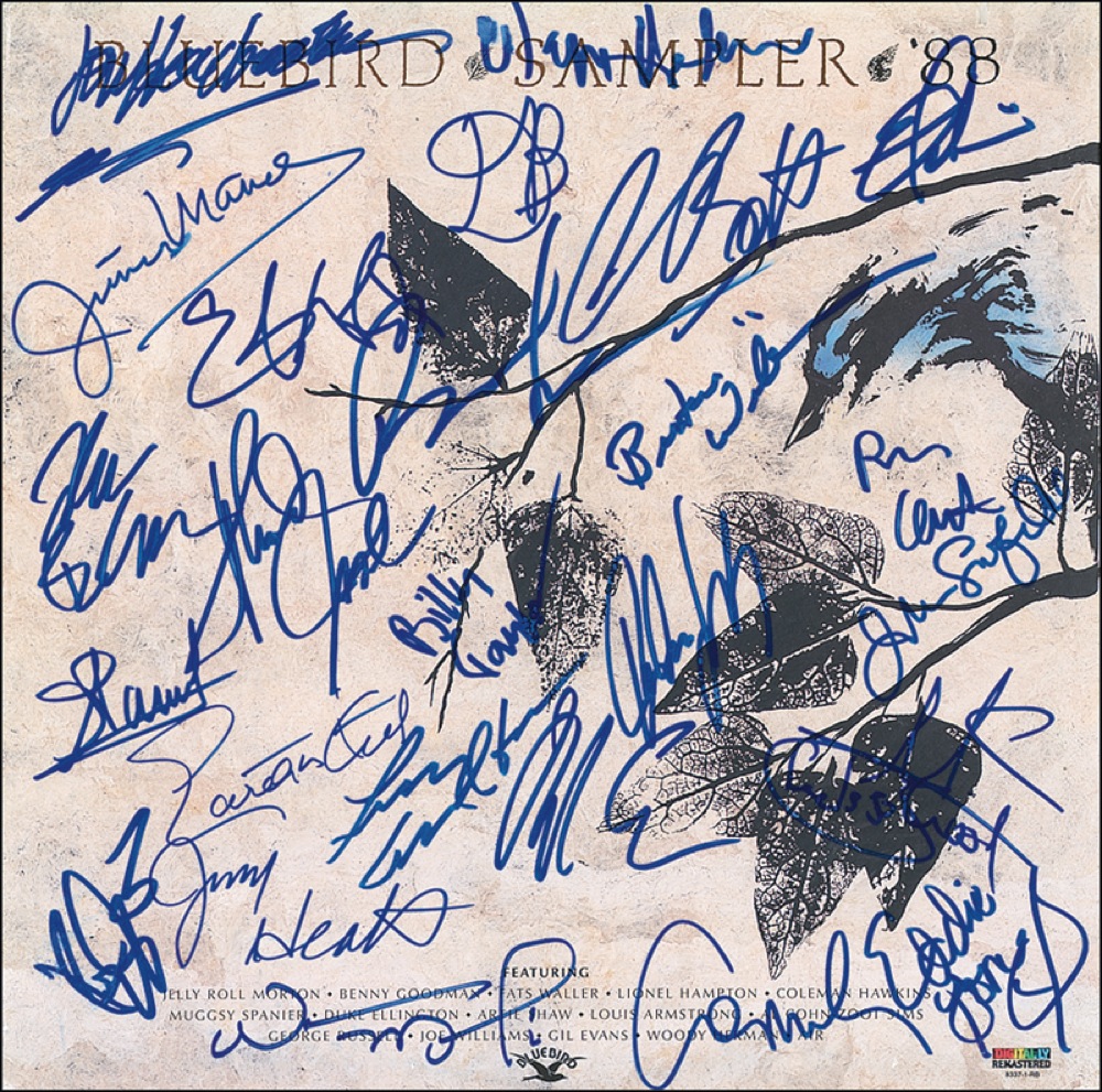 Bluebird Sampler ’88 album, signed on the front cover in blue felt tip by 26 jazz greats: Dave Brubeck (initials only), Ahmad Jamal, Chuck Mangione, Wynton Marsalis, Ron Carter, Jon Hendricks, Al DiMeola, George Duke, Eartha Kitt, Roy Ayers, Billy Taylor, Buster Williams, Junior Mance, Jimmy Heath, Arturo Sandoval, Poncho Sanchez, Eddie Palmieri, Wayne Henderson, Larry Carlton, John Scofield, David Sanborn, Earl Klugh, Ronnie Laws, Eddie Gomez, Joshua Redman, and Chris Botti. In fine condition, with a discount cut to sleeve. The record is included. RRAuction COA.