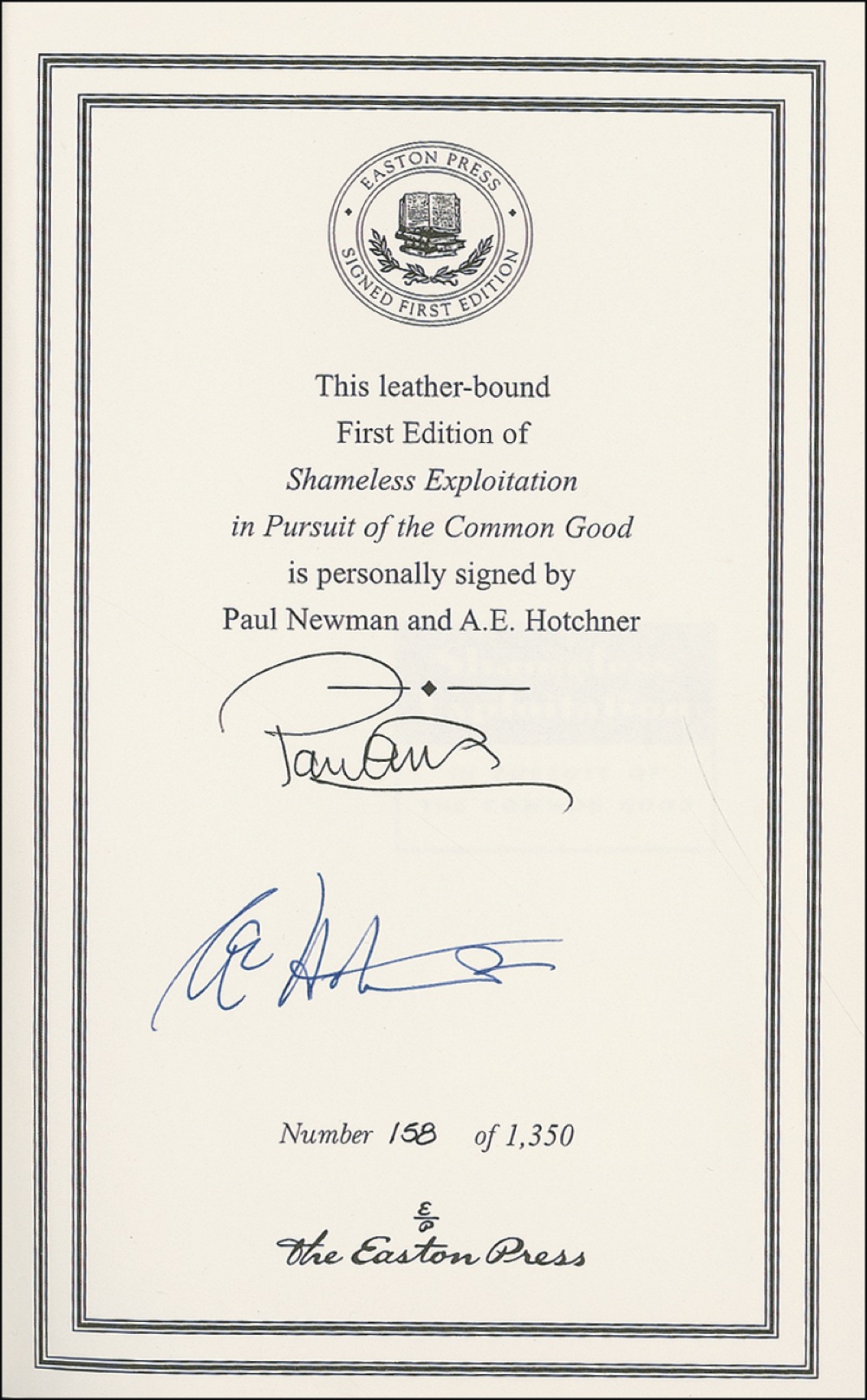 Signed book: Shameless Exploitation in Pursuit of the Common Good. Limited edition of 1350 copies (this copy No. 158). Connecticut: Easton Press, 2003. Leather-bound hardcover, 6.25 x 9.25, 253 pages. Signed in ink on the limitation page by Newman and Hotchner. In very fine condition. RRAuction COA.