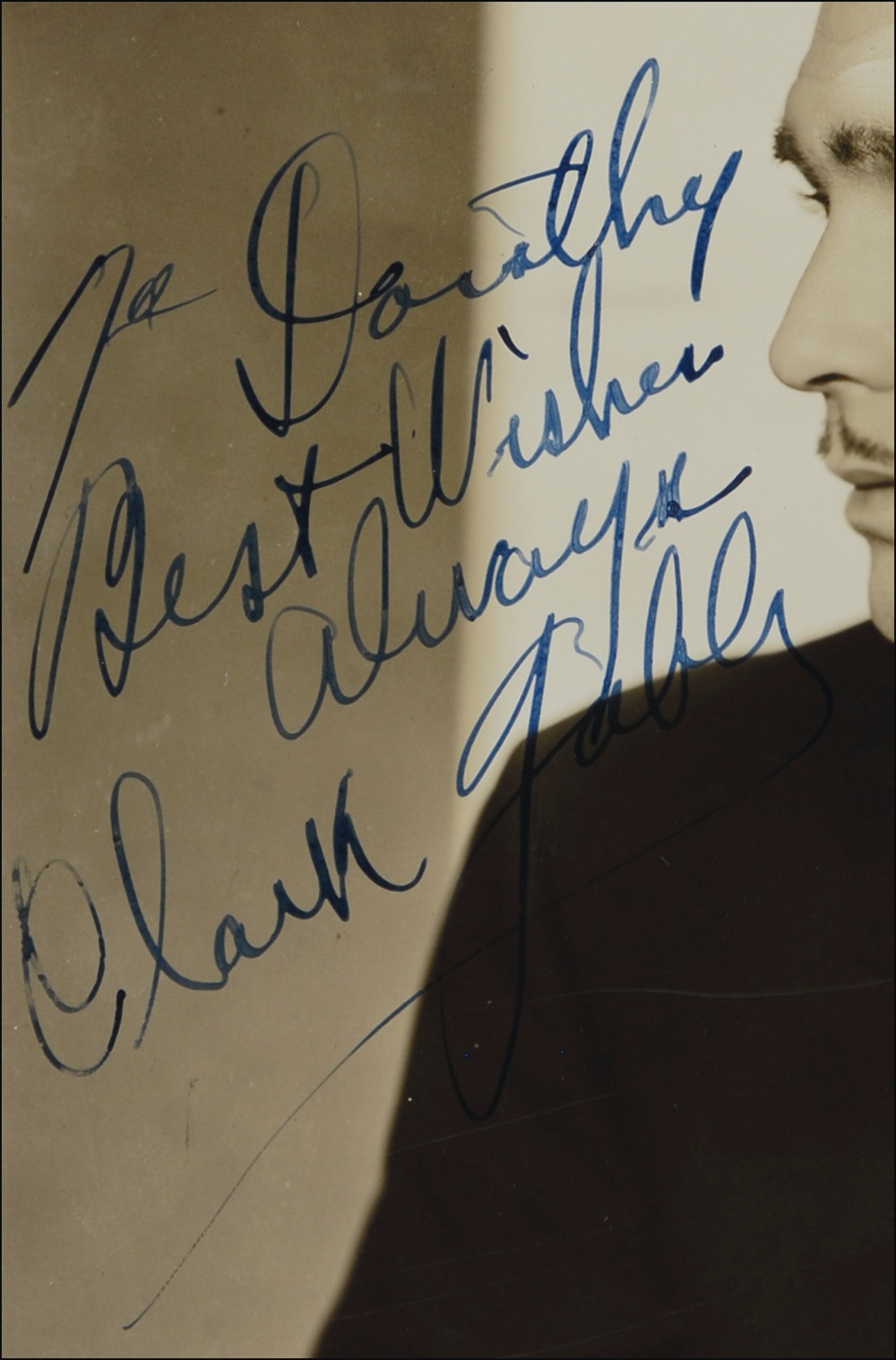 Dashing vintage glossy 8 x 10 MGM publicity photo of Gable in a dark suit, signed and inscribed in fountain pen “To Dorothy, Best wishes always, Clark Gable.” Slight contrast to portions of a couple of letters of last name, and scattered light creases and surface marks, not detracting from the overall appearance, otherwise fine condition. A handsome and boldly signed example! RRAuction COA.
