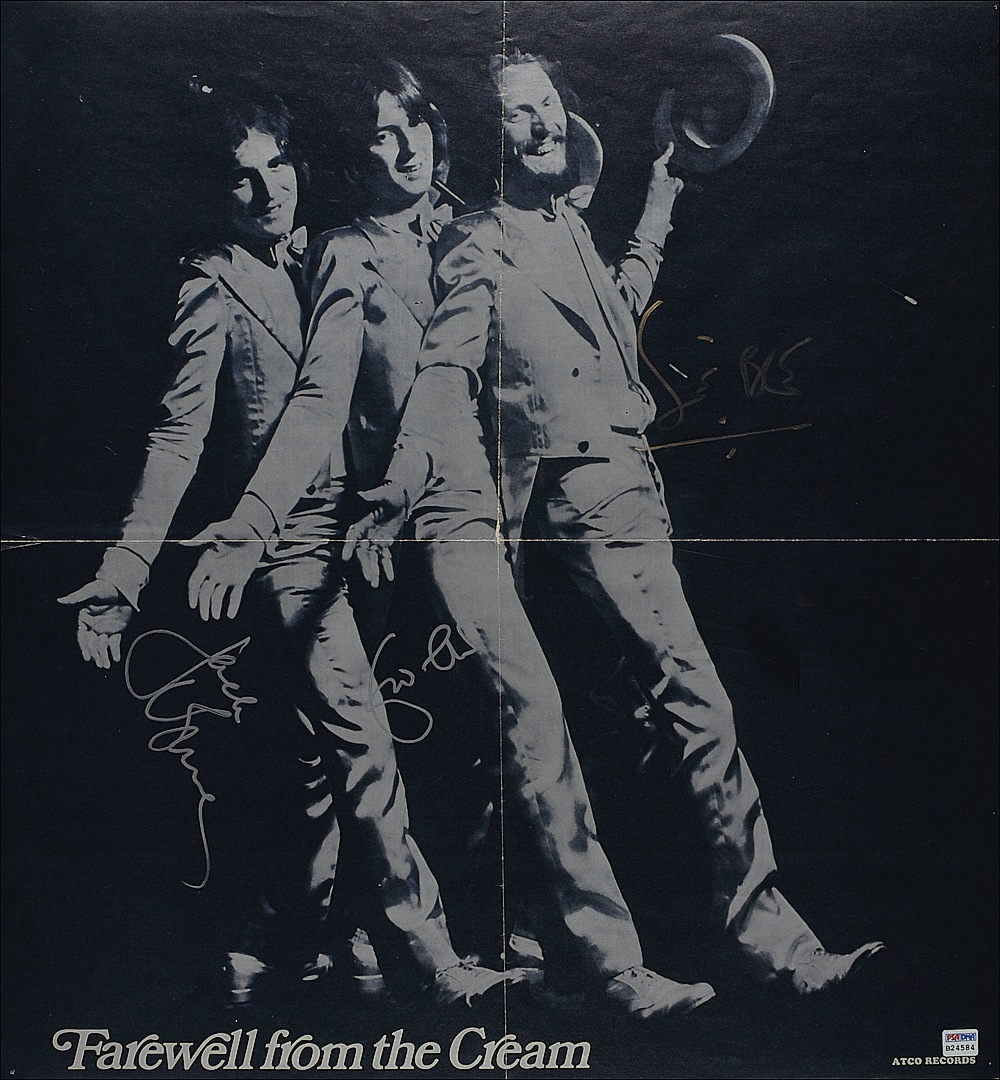 Farewell from the Cream poster, 21.5 x 23, signed in silver ink by Eric Clapton and Jack Bruce, and in gold ink by Ginger Baker. Accompanied by a letter of authenticity from PSA/DNA. Folded and in fine condition, with a single tack hole to each corner. JSA/Roger Epperson (REAL) Auction LOA and RRAuction COA.
