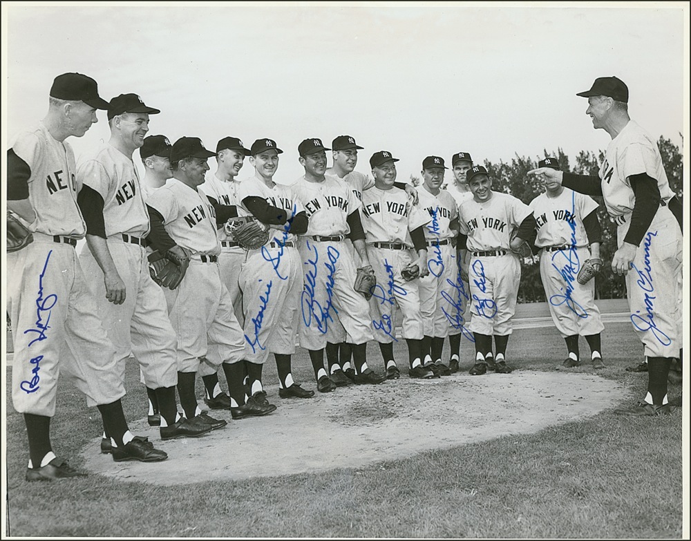 Glossy 14 x 11 photo of the 1952 Yankees pitchers and catcher during spring training, signed in blue felt tip by Yogi Berra, Jim Turner, Jim McDonald, Allie Reynolds, Ed Lopat, Bob Kuzava, Charlie Silvera, Johnny Sain, and Ralph Houk. In fine condition, with a small area of bubbling to emulsion near bottom. JSA/Mike Gutierrez Auction LOA and RRAuction COA.
