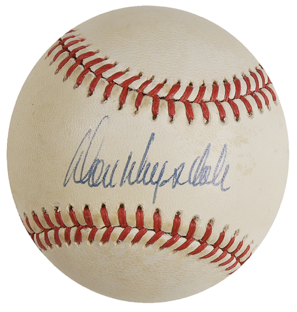 Official Rawlings National League baseball, signed in blue ballpoint on the sweet spot. Accompanied by a certificate of authenticity from PSA/DNA. In very good condition, with light toning and a bit of scattered light foxing. JSA/Mike Gutierrez Auction LOA and RRAuction COA.