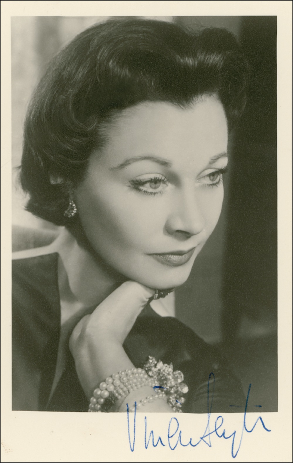 Vintage matte-finish 3.5 x 5.5 head-and-shoulders photo, signed in blue ballpoint in the lower border. Accompanied by an unsigned vintage publicity photo of Leigh from Fire Over England. In very fine condition. RRAuction COA.