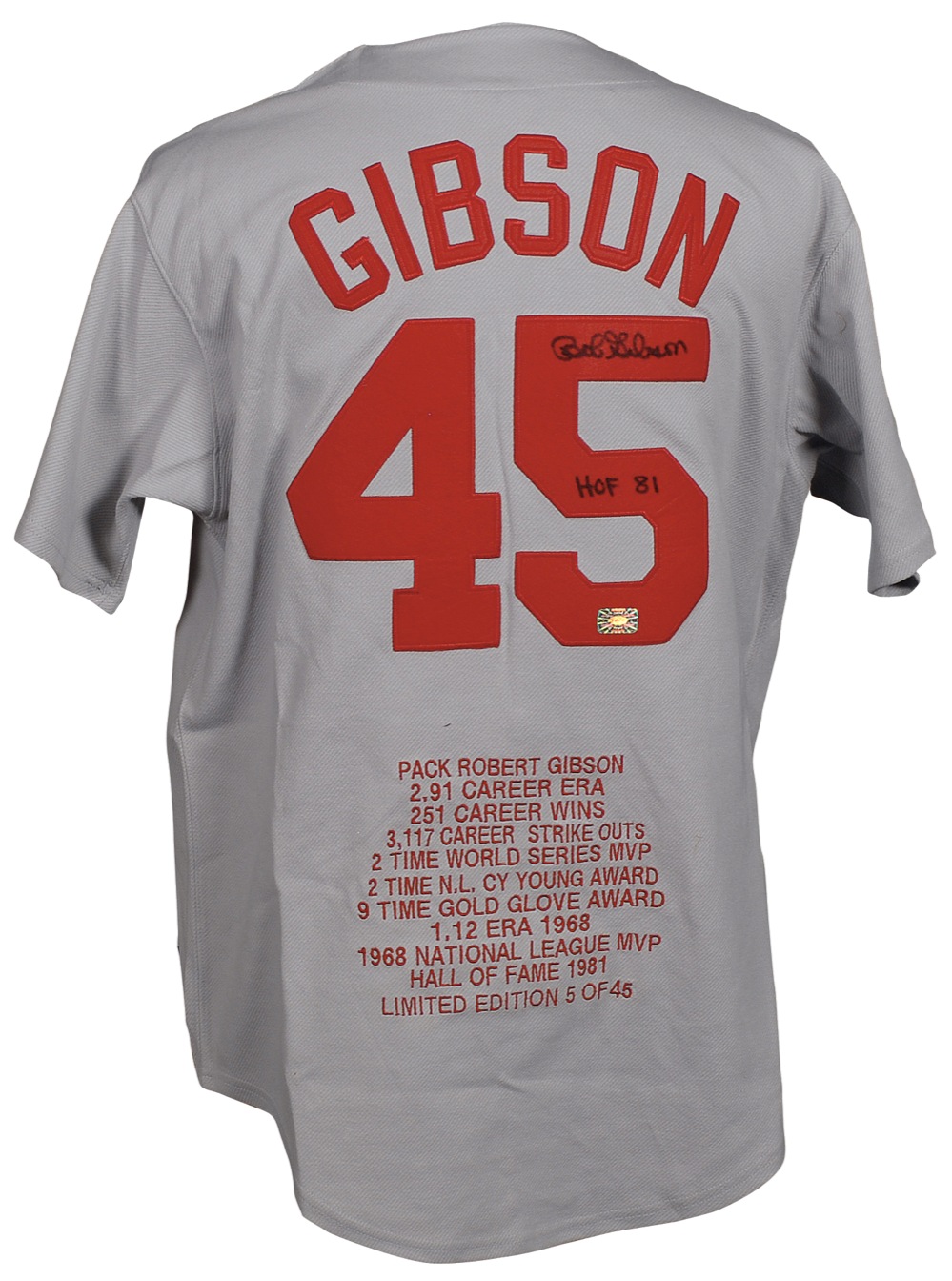 Official limited edition Majestic replica St. Louis Cardinals baseball career statistical jersey, numbered 5/45, with sewn-on letters and numbers and Gibson’s career highlights embroidered on the back, signed in black felt tip on the number on the back “Bob Gibson HOF 81.” In very fine condition. JSA/Mike Gutierrez Auction LOA and RRAuction COA.