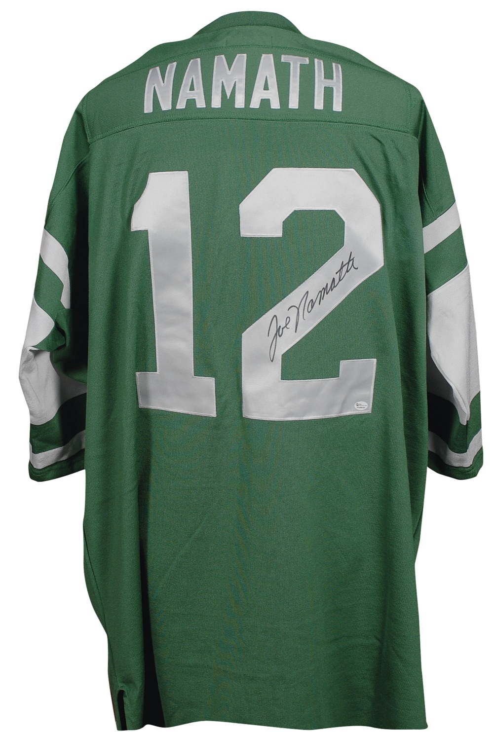 Official Mitchell & Ness replica New York Jets throwback football jersey, with sewn-on letters and numbers, signed in black felt tip on the number on the back. In very fine condition. JSA/Mike Gutierrez Auction LOA and RRAuction COA.