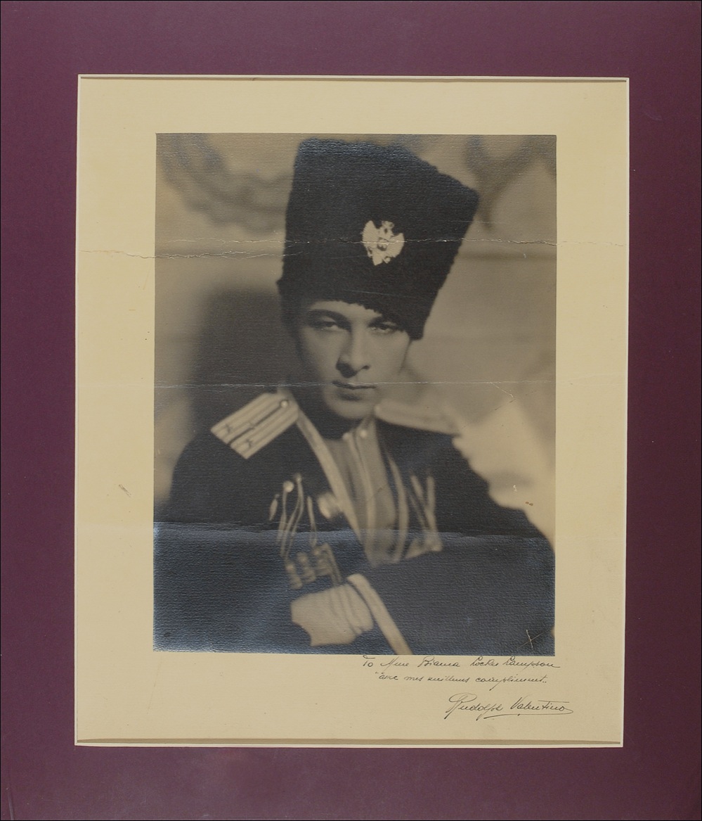 Italian-born actor (1895–1926) who became the most legendary sex symbol of the silent era. His premature death from a perforated ulcer induced a wave of fan hysteria unmatched until the modern “paparazzi” age, including riots and suicide attempts by grief-stricken fans. In an era filled with baseball immortals, heroes from the First World War, and proliferators of the earliest popular motion pictures, Rudolph Valentino (1895-1926) was in a class of his own. But, like many preeminent headliners—though by no accounts as afflicted by some of life’s more dubious attractions—Valentino was the victim of an untimely death. (The actor died at the age of thirty-one from the sudden onset of peritonitis.) This impressive and oversized item pictures Valentino as he appeared in his second-to-last film, The Eagle. The rare, late-in-life depiction of the actor in Cossack boasts an equally scarce example of the icon’s autograph. The potent signature and inscription at bottom right read, “To Mme. Bianca Locke Lampson avec mes meilleurs compliments, Rudolph Valentino.” A trio of horizontal creases affects the subject’s famously handsome countenance, and other age-induced surface faults are present in the form of mild soiling and silvering. The signature remains distinct, however, appearing well-contrasted and virtually flawless. Measuring to 15 x 18 dimensions and neatly housed within a 19.5 x 22.75 frame. It should be noted that expert restoration to the photo could very well yield one of the finest signed Valentino images extant! RRAuction. COA.