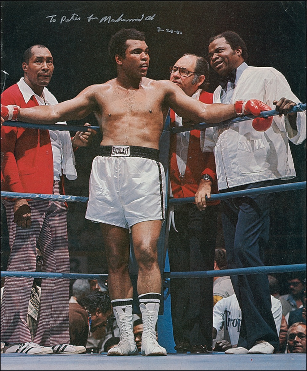 Color 9 x 11 book photo, signed and inscribed in silver ink “To Peter from Muhammad Ali 3-28-91.” Accompanied by a letter of authenticity from James Spence. In fine condition, with slightly rough left edge from removal. RRAuction COA.