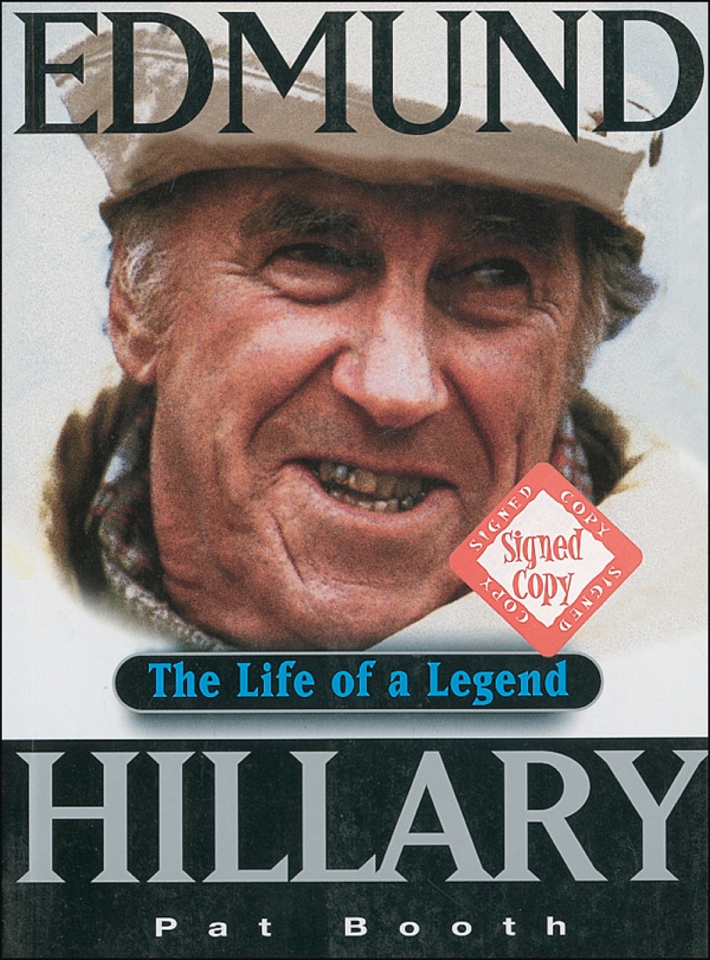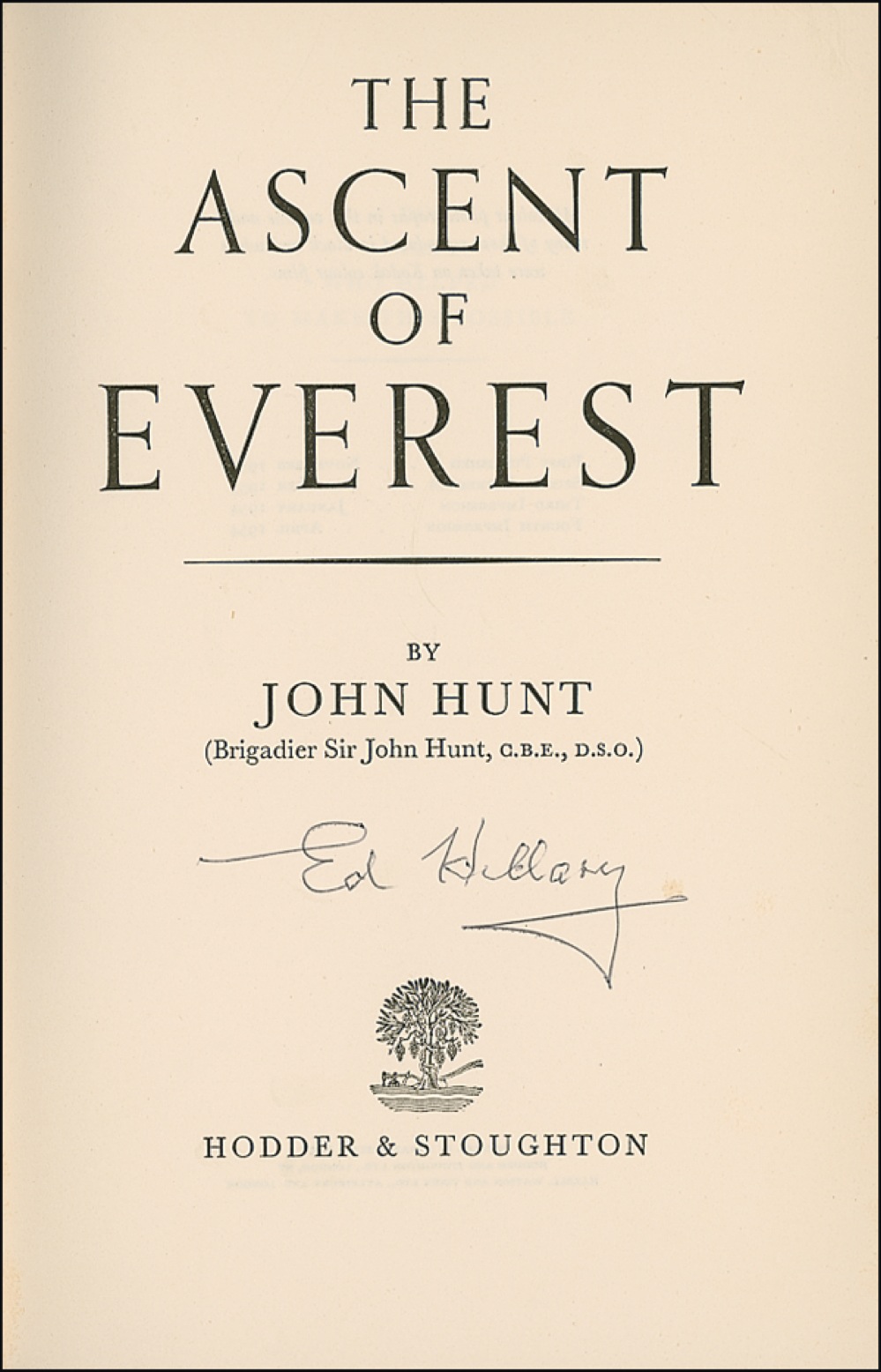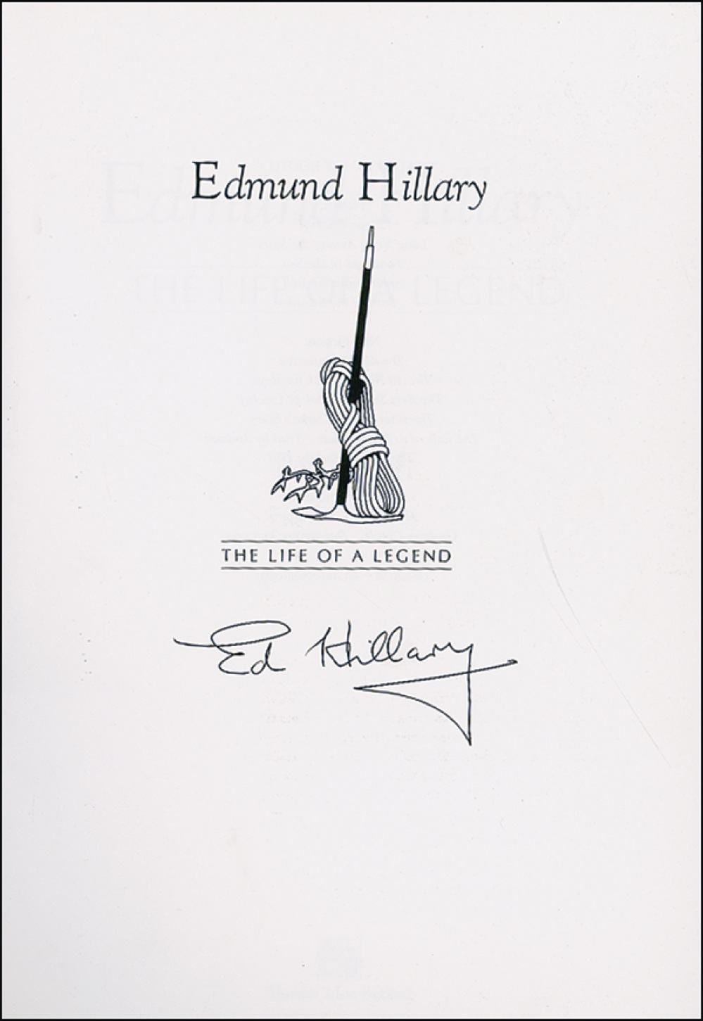 Two books: The Ascent of Everest by John Hunt (hardcover, 1954), signed in ballpoint “Ed Hillary”; and Edmund Hillary: The Life of a Legend by Pat Booth (softcover, 1998), signed in black ink on the half-title page. Slight cracking to front hinge of first book, and light soiling to edges, otherwise fine condition. RRAuction COA.