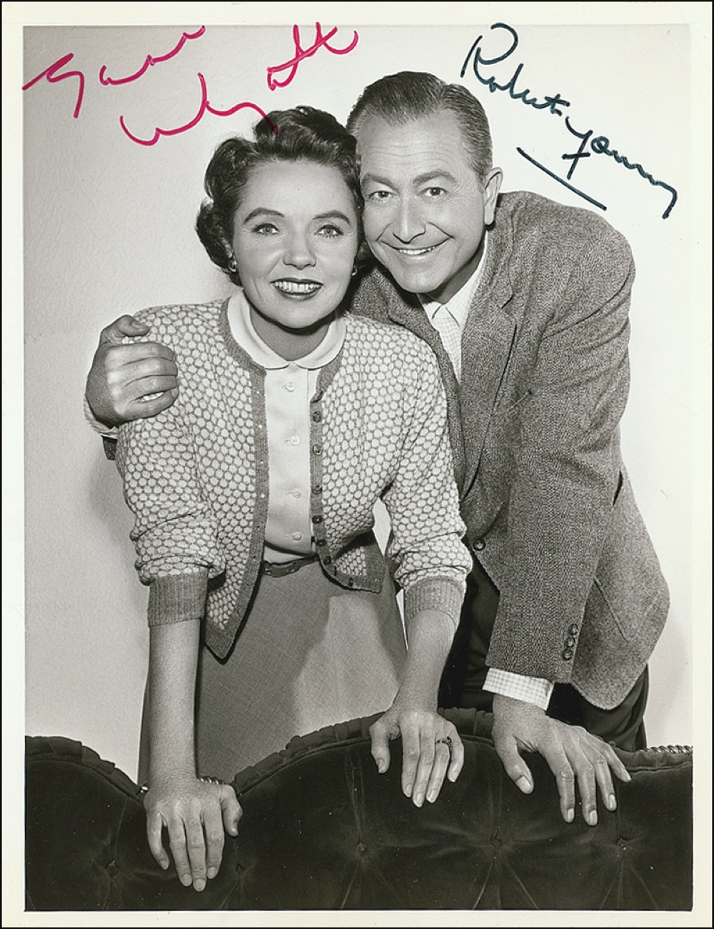 Glossy 7 x 9 photo, signed in black felt tip by Robert Young and in red felt tip by Jane Wyatt. A few small creases, dings, and surface marks, otherwise fine condition. RRAuction COA.