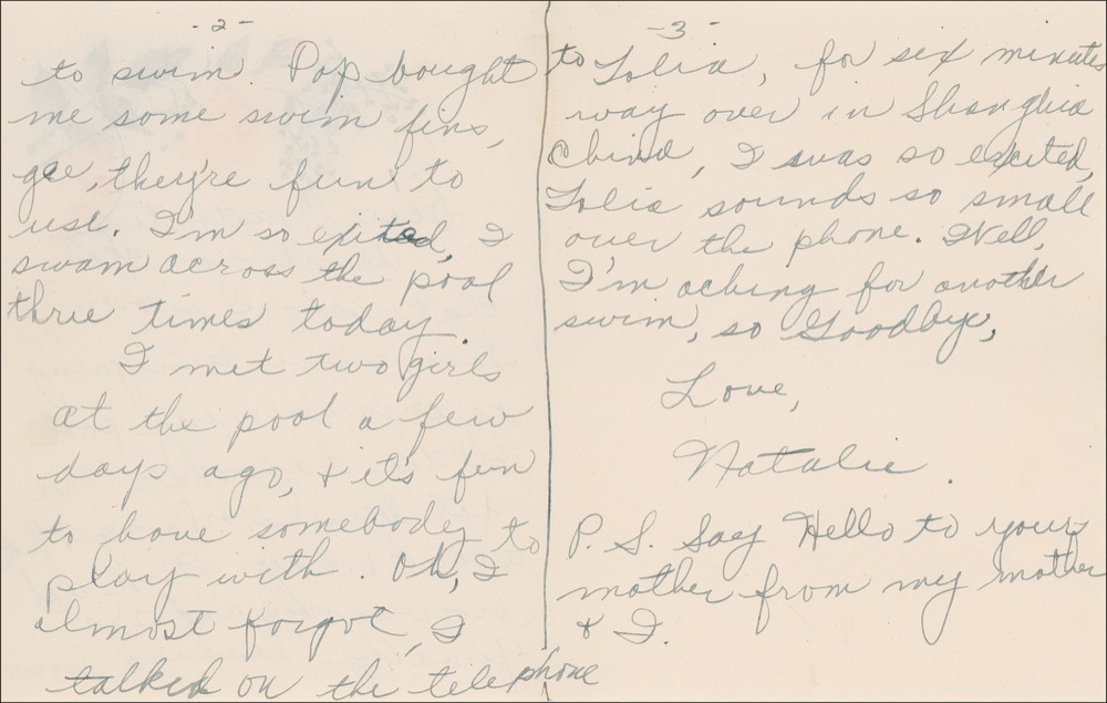 What better content could one ask for in a letter from Natalie Wood (1938-1981) than one remarking on her newfound passion for swimming—her childhood obsession that transformed into a great fear of drowning, which ultimately was the cause of her death. A youthful Wood (circa 1940s) writes to cousin Constantine Luizunie confessing: “Aren’t you glad that school is over? I am & I’ve been going to a swimming pool all the days that I’ve not been working. That’s about 6 days. I’m real brown now, and I’ve finally learned how to swim. Pop bought me some swim fins, gee, they’re fun to use. I’m so exited [sic], I swam across the pool three times today. I met two girls at the pool a few days ago, & its fun to have somebody to play with. Oh, I almost forgot, I talked on the telephone to Talia, for six minutes way over in Shanghia [sic] China, I was so excited, Talia sounds so small over the phone. Well, I’m aching for another swim, so Goodbye, Love, (signed) Natalie.” Then, following her potent signature, Wood adds, “Say Hello to your mother from my mother & I.” The letter is penned entirely in Wood’s cursive hand along three pages (two adjoining sheets) of floral stationery. The 3.75 x 5 memento exhibits fine condition, and the childhood star’s black fountain pen writing remains remarkably clear. Wood’s sincere note, making known to a close relative her love of swimming, is particularly interesting in light of her well-documented fear of drowning—a phobia that affected the starlet’s efforts in water-related films such as “The Ghost and Mrs. Muir” and “This Property is Condemned.” On November 29, 1981, while yachting with husband Robert Wagner and actor Christopher Walken, Wood slipped off the luxury vessel and drowned. PSA/DNA pre-approval and RRAuction COA.