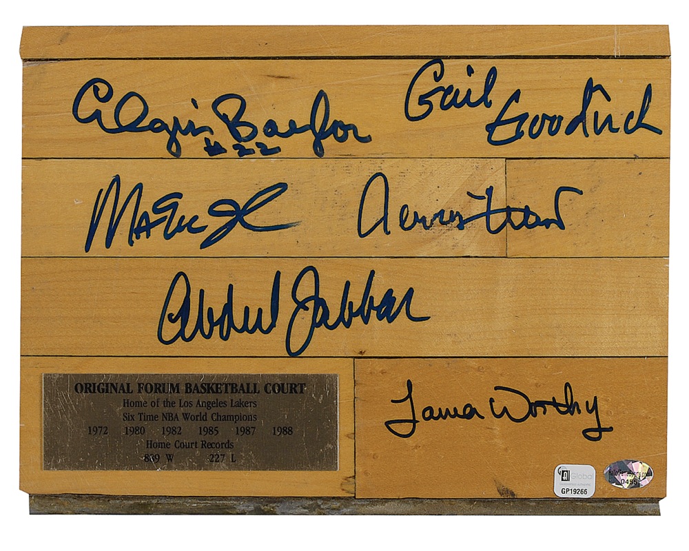 Original section of floor from the Great Western Forum basketball court, with affixed engraved plaque, 10 x 7.25, signed in felt tip by Elgin Baylor, James Worthy, Kareem Abdul Jabbar, Gail Goodrich, Jerry West, and Magic Johnson. Accompanied by tickets and passes from the original signing events at which the signatures were obtained. Housed in the original presentation box. Expected light wear to surface from use, two small authentication labels, and wear to box, otherwise fine condition. JSA/Mike Gutierrez Auction LOA and RRAuction COA.