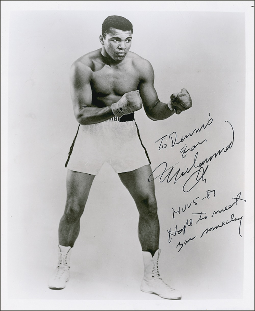 Glossy 8 x 10 photo, signed and inscribed in black felt tip “To Dennis from Muhammad Ali, Nov, 5-83, Hope to meet you someday.” In fine condition, with several surface impressions and a couple of light edge creases. JSA/Mike Gutierrez Auction LOA and RRAuction COA.