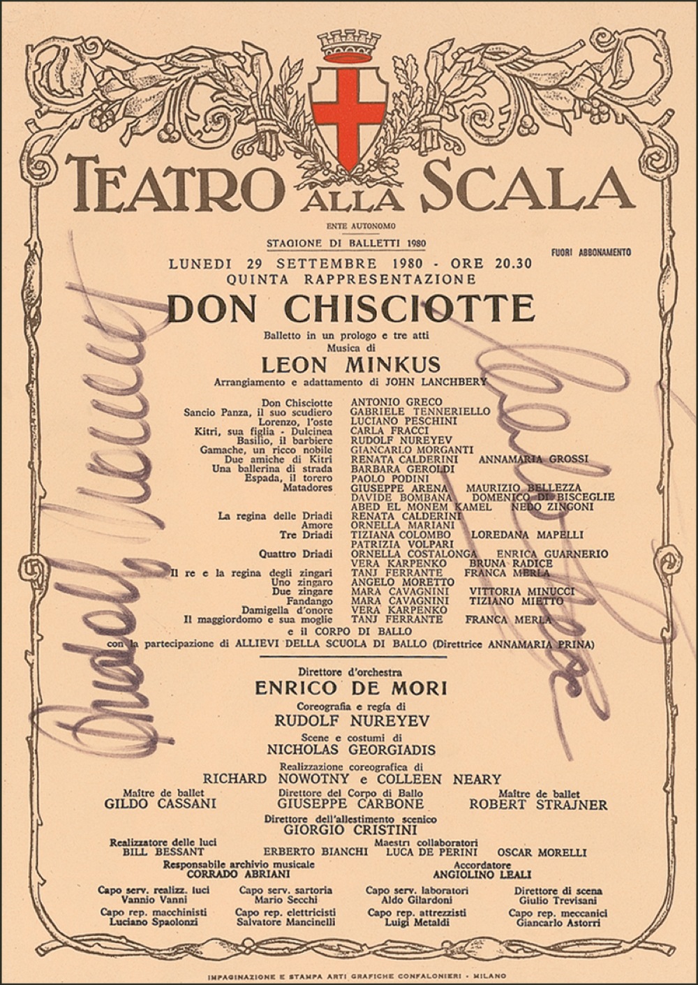 Program for a performance of the ballet Don Chisciotte by Leon Minkus at La Scala, 6.5 x 9.25, September 29, 1980, signed vertically in black felt tip by Nureyev and Italian dancer Carla Fracci. In very fine condition. RRAuction COA.