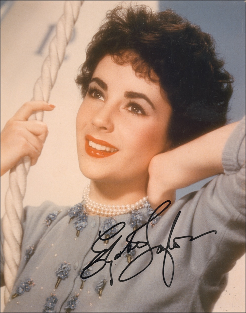 Color glossy 8 x 10 photo of a younger Taylor, affixed to a same-sized card, signed in black felt tip. Light rippling from mounting and slightly trimmed edges, otherwise fine condition. RRAuction COA.
