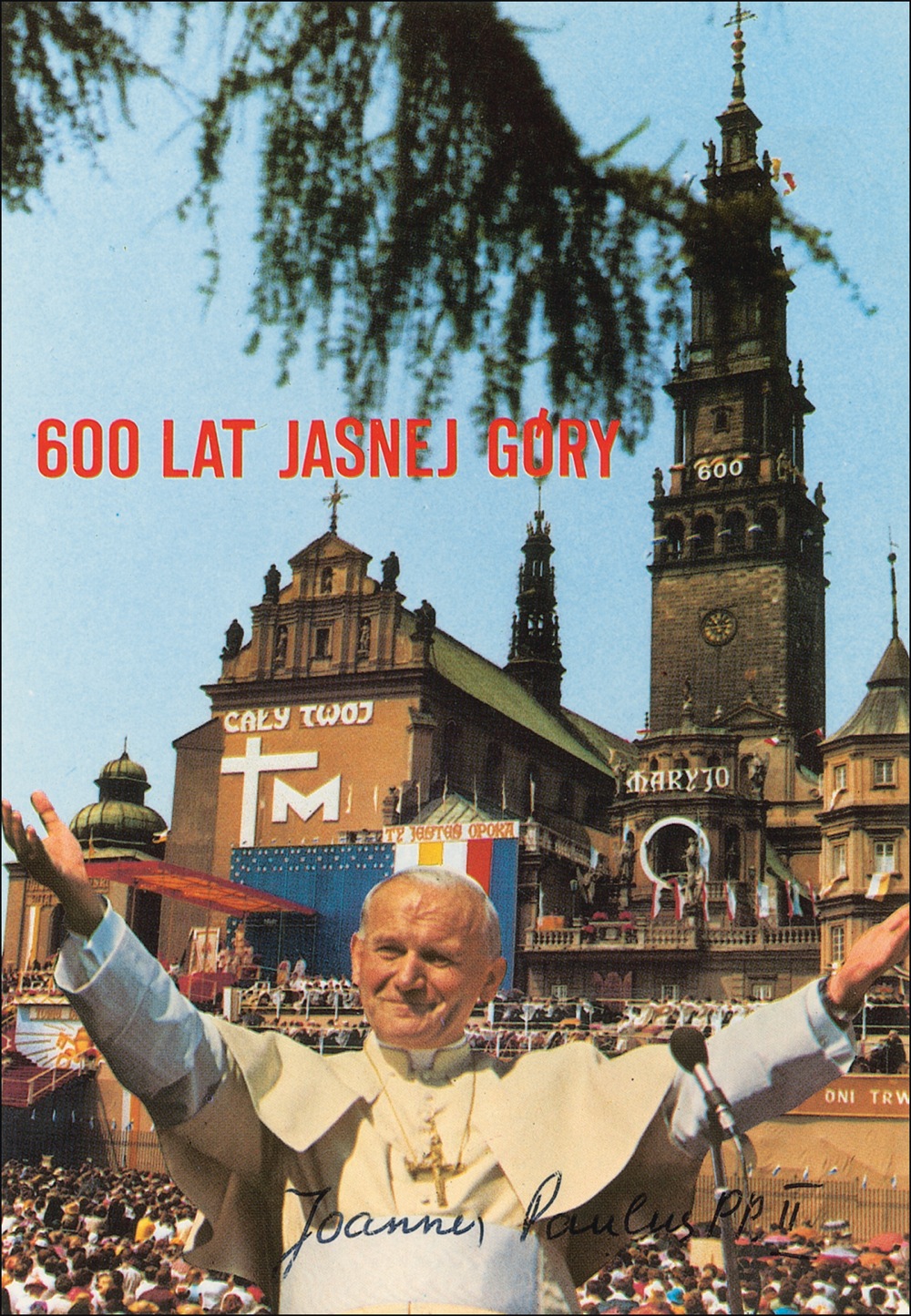 Color 4 x 6 postcard photo of the Holy Father at the 600th anniversary of the Polish monastery Jasna Gora, signed in black ballpoint “Joannes Paulus P.P. II.” In fine condition, with light contrast to a few letters of signature. RRAuction COA.