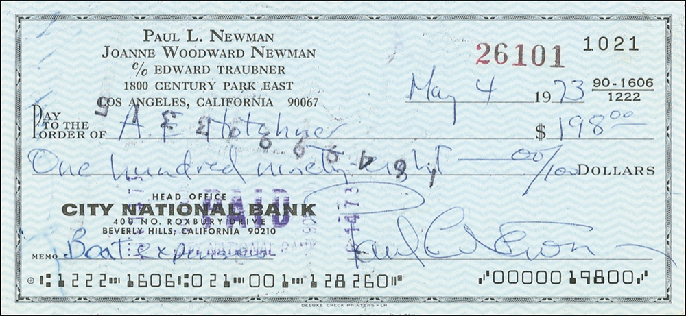 Personal check, 6 x 2.75, filled out and signed by Newman, payable to A. E. Hotchner for $198.00, May 4, 1973. The recipient (born 1920) is a respected writer perhaps best known for his 1966 biography of Ernest Hemingway. Hotchner later partnered with Newman in the wildly successful Newman’s Own line of food products, which became one of the greatest successes in the history of modern philanthropy, raising in excess of $250 million for various charities. Bank stamp to first letter of signature, otherwise fine condition. RRAuction COA.