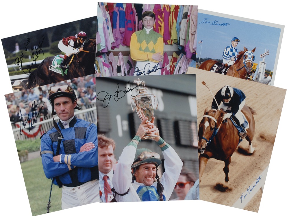 Six color glossy and satin-finish photos, five 8 x 10 and one 10 x 8, each signed in felt tip by the jockey pictured: Steve Cauthen, Jerry Bailey, Gary Stevens, Ron Turcotte (two), and Javier Castellano. In fine condition. RRAuction COA.