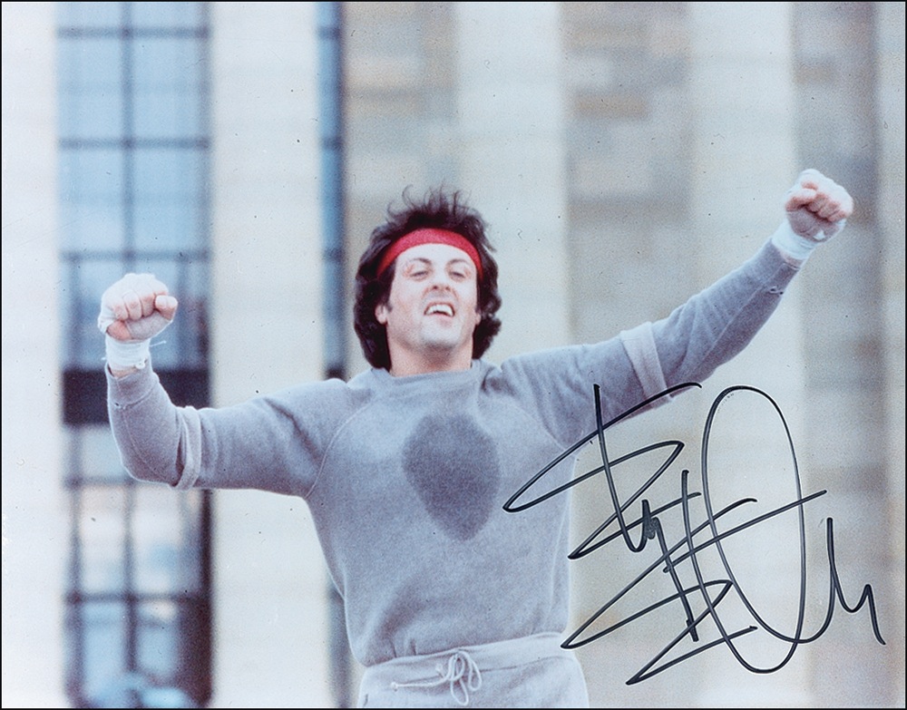Color glossy 10 x 8 photo of Stallone as the celebrating Rocky Balboa, signed in black felt tip. In very fine condition. RRAuction COA.