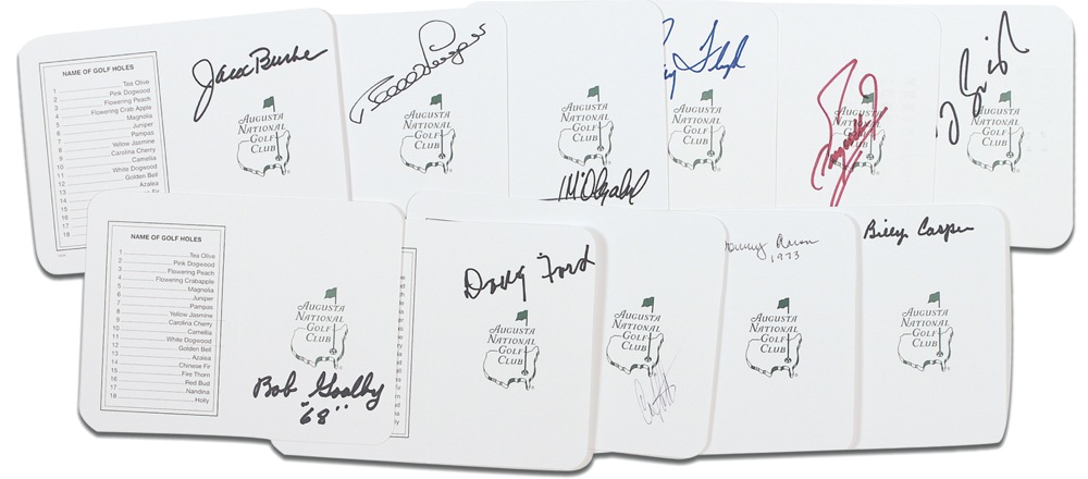 Eleven Augusta National Golf Club scorecards, measuring 6.5 x 5 opened, signed on either side in felt tip by 11 former Masters champions: Bob Goalby, Doug Ford, Craig Stadler, Tommy Aaron, Billy Casper, Bernhard Langer, Jose Maria Olazabel, Ray Floyd, Vijay Singh, Fuzzy Zoeller, and Jack Burke. In fine condition. RRAuction COA.