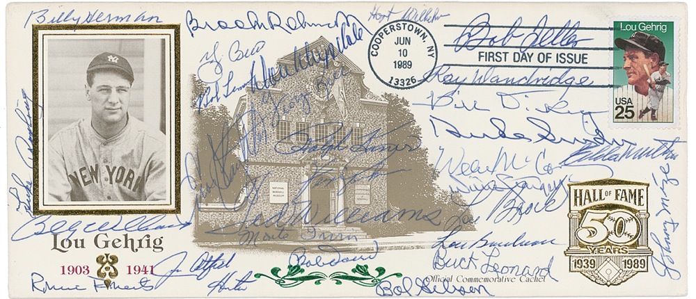 FDC with a cachet honoring Lou Gehrig, 9.5 x 4, 1989, signed in ballpoint by Billy Herman, Luke Appling, Billy Williams, Robin Roberts, Brooks Robinson, Hoyt Wilhelm, Yogi Berra, Bob Lemon, Don Drysdale, George Kell, Enos Slaughter, Ralph Kiner, Fergie Jenkins, Ted Williams, Monte Irvin, Bob Doerr, Jim “Catfish” Hunter, Bob Feller, Roy Dandridge, Bill Dickey, Duke Snider, Willie McCovey, Willie Stargell, Lou Brock, Lou Boudreau, Buck Leonard, Bob Gibson, Johnny Mize, and Eddie Mathews. In fine condition. JSA/Mike Gutierrez Auction LOA and RRAuction COA.