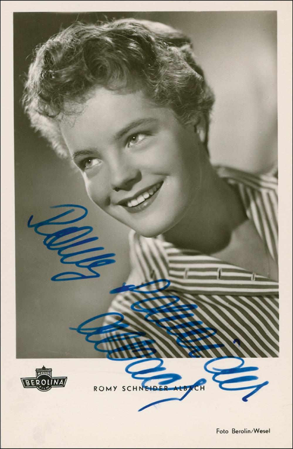 Respected Vienna-born actress (1938–1982) whose death, though officially ruled heart failure, was believed by many to have been a suicide induced by a string of personal tragedies, including the accidental death of her 14-year-old son. Vintage 3.5 x 5.5 German postcard photo, signed in fountain pen, “Romy Schneider Albach.” Schneider was billed as Schneider-Albach in only one movie, 1953’s Wenn der weisse Flieder wieder blüht, dropping her surname shortly thereafter. In fine condition. RRAuction COA.