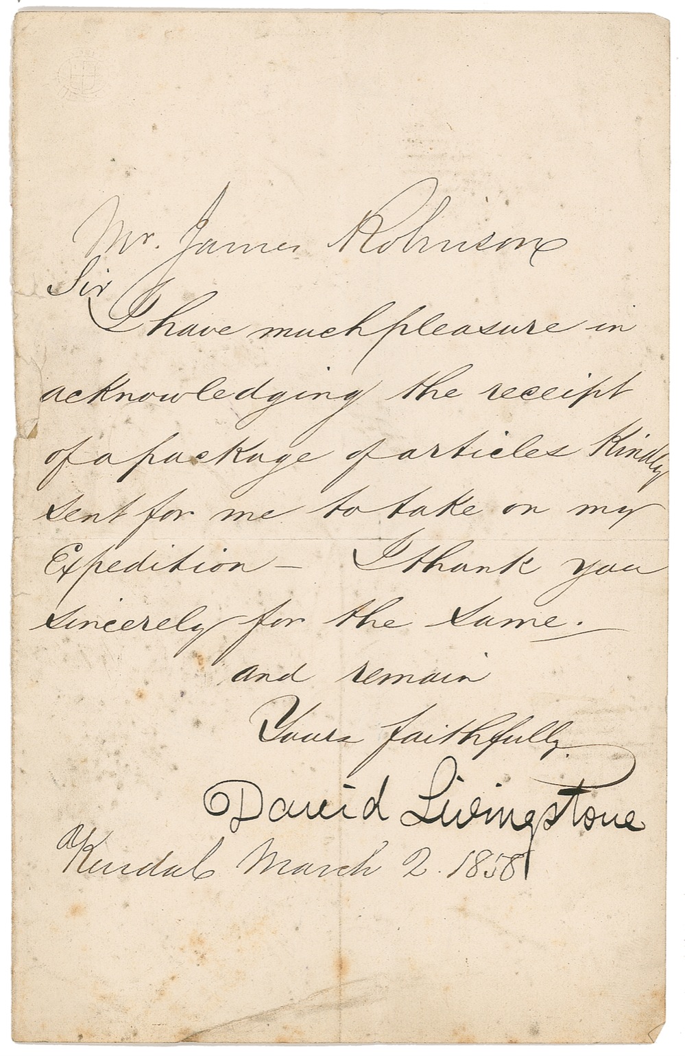 Scottish missionary and explorer (1813–1873). After “disappearing” on an expedition to find the source of the Nile, Livingstone was found in 1871 by fellow explorer Henry M. Stanley, who made the famous query, “Dr. Livingstone, I presume?” LS, one page, 4.5 x 7, March 2, 1858. Livingstone writes from Kandal to James Robinson. In full: “I have much pleasure in acknowledging the receipt of package of articles kindly sent for me to take on my Expedition— I think you sincerely for the same….” Livingstone’s Zambezi Expedition took place from March 1858 to mid-1864. Numerous difficulties along the way, substantial expense, and Livingstone’s failure to find a navigable route to the African interior led to the British government’s recall of the expedition and widespread criticism of Livingstone in the press. In very good condition, with intersecting folds (vertical fold to first name), soiling and spotting, and a few wrinkles, small tears, and holes (tape repair to reverse). RRAuction COA.