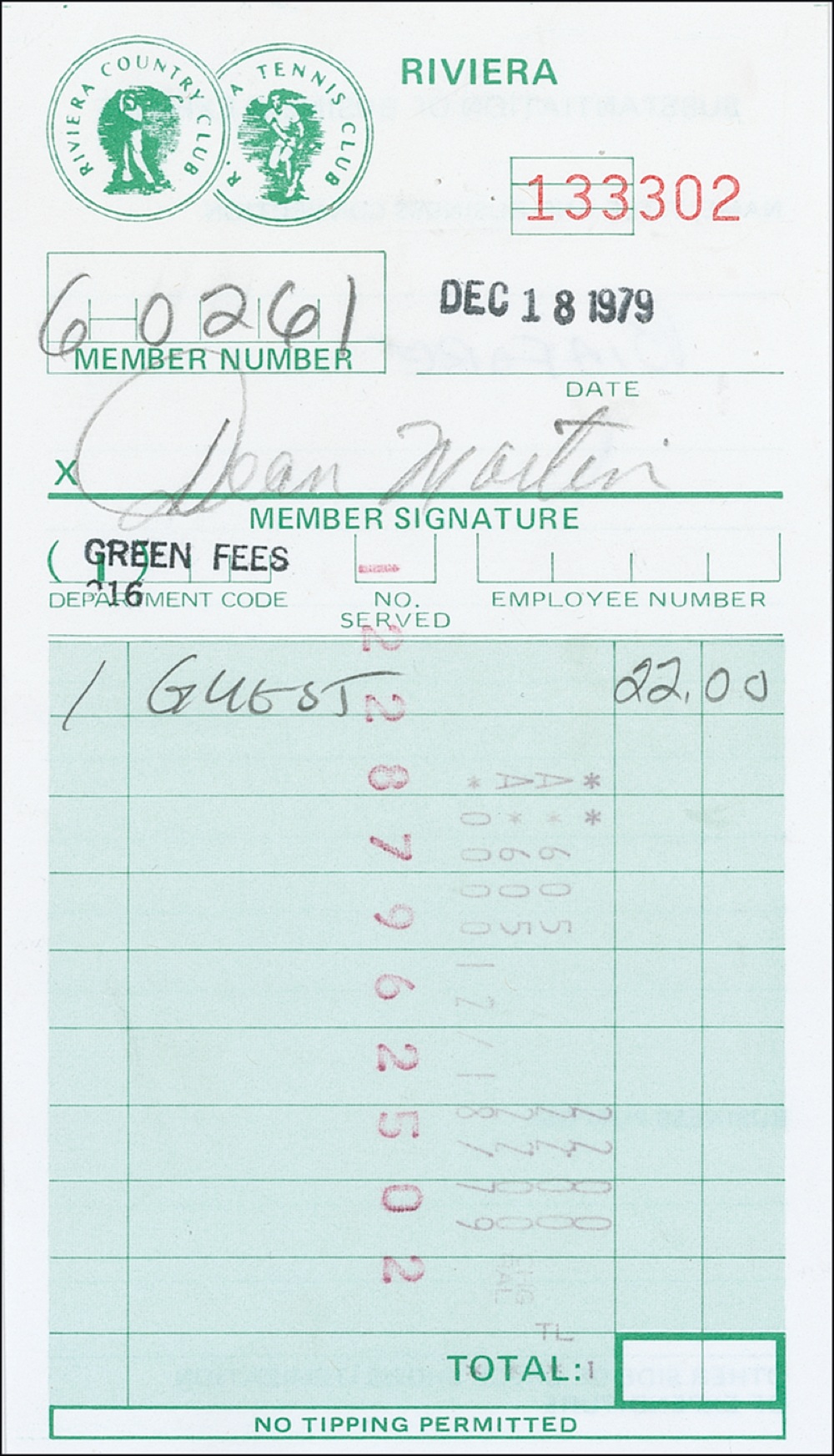 DS, signed in pencil “Dean Martin,” one page, 3.25 x 6, December 18, 1979. A guest receipt from the Riviera Country Club. A few small creases, otherwise fine condition. RRAuction COA.