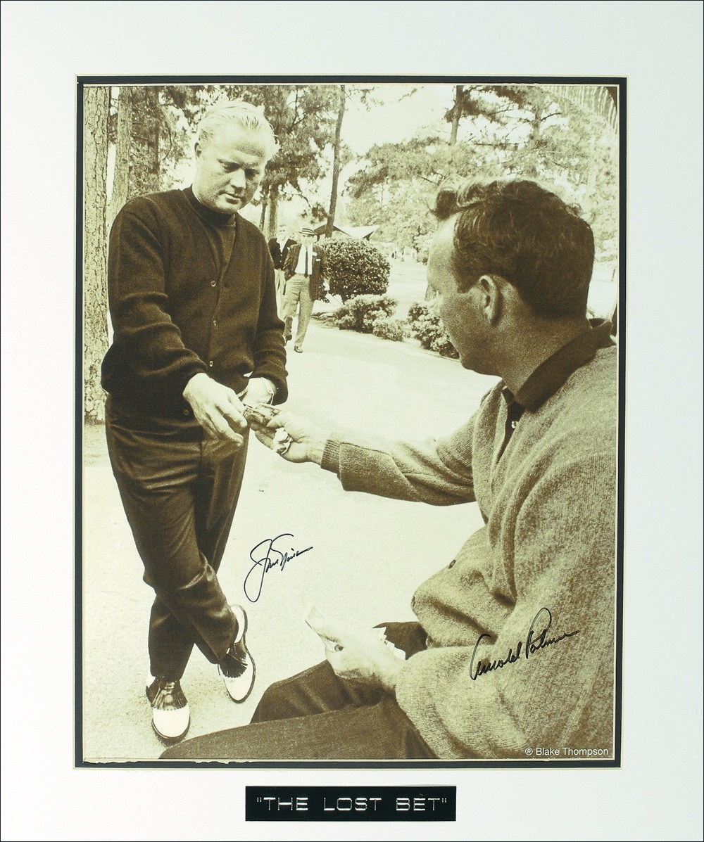 Poster-style 16 x 21.25 paperstock photo titled The Lost Bet, signed in black felt tip by Jack Nicklaus and Arnold Palmer. Matted with an engraved plaque to an overall size of 20 x 24. A few minor dings, and photo taped to mat at top edge of reverse, otherwise fine condition. JSA/Mike Gutierrez Auction LOA and RRAuction COA.