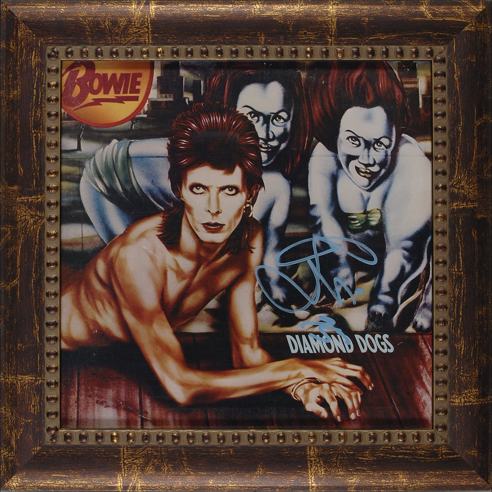 Diamond Dogs album, signed in blue ink on the front cover “David Bowie 95.” Framed to an overall size of 16 x 16. In fine condition. The record is not included. RRAuction COA.