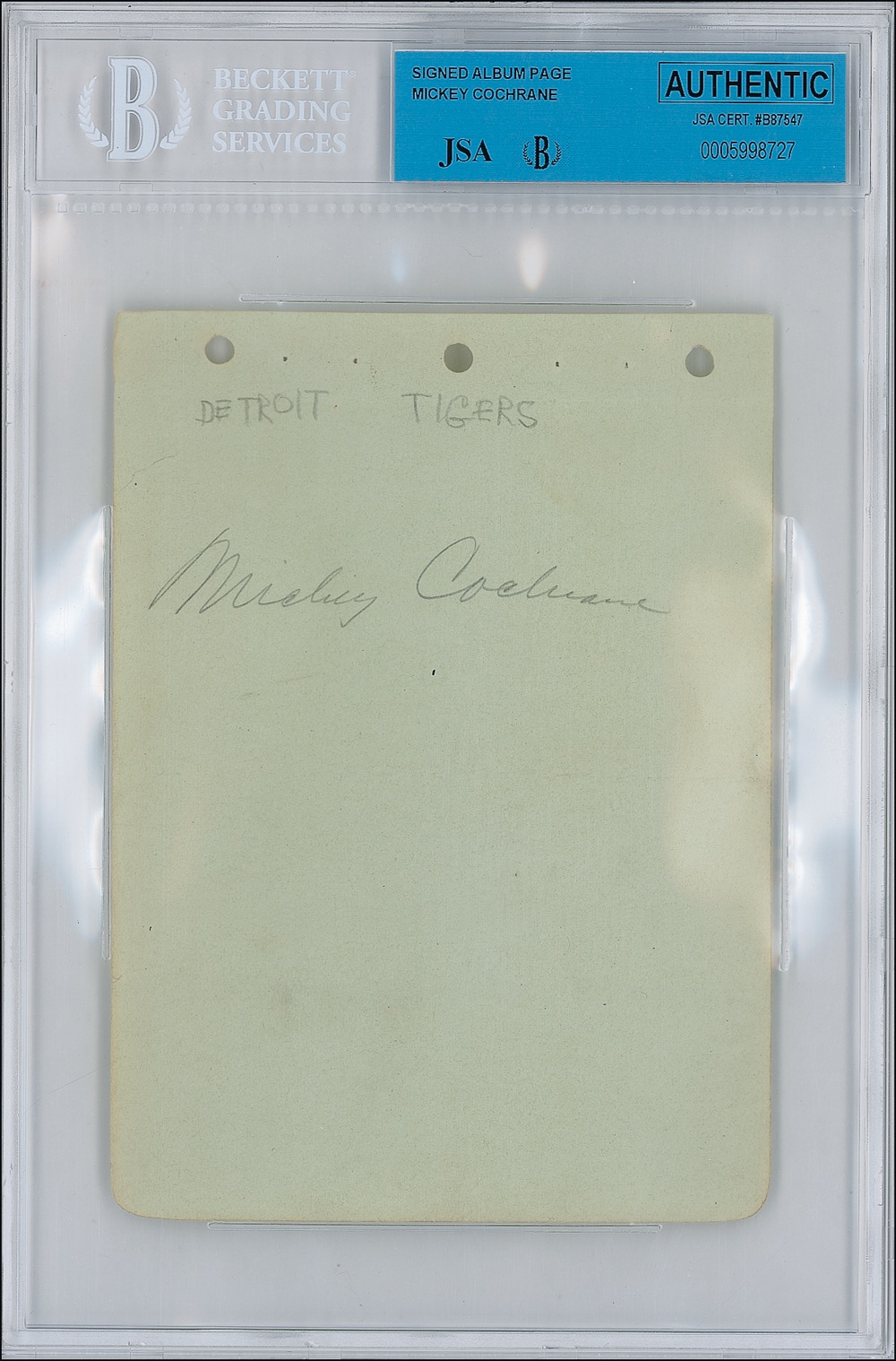 Vintage pencil signature, “Mickey Cochrane,” on a light green 4.5 x 6 album page. Encapsulated in a plastic Beckett/JSA authentication holder. In fine condition, with punch and binding holes along top edge and a small collector’s notation at top. JSA/Mike Gutierrez Auction LOA and RRAuction COA.